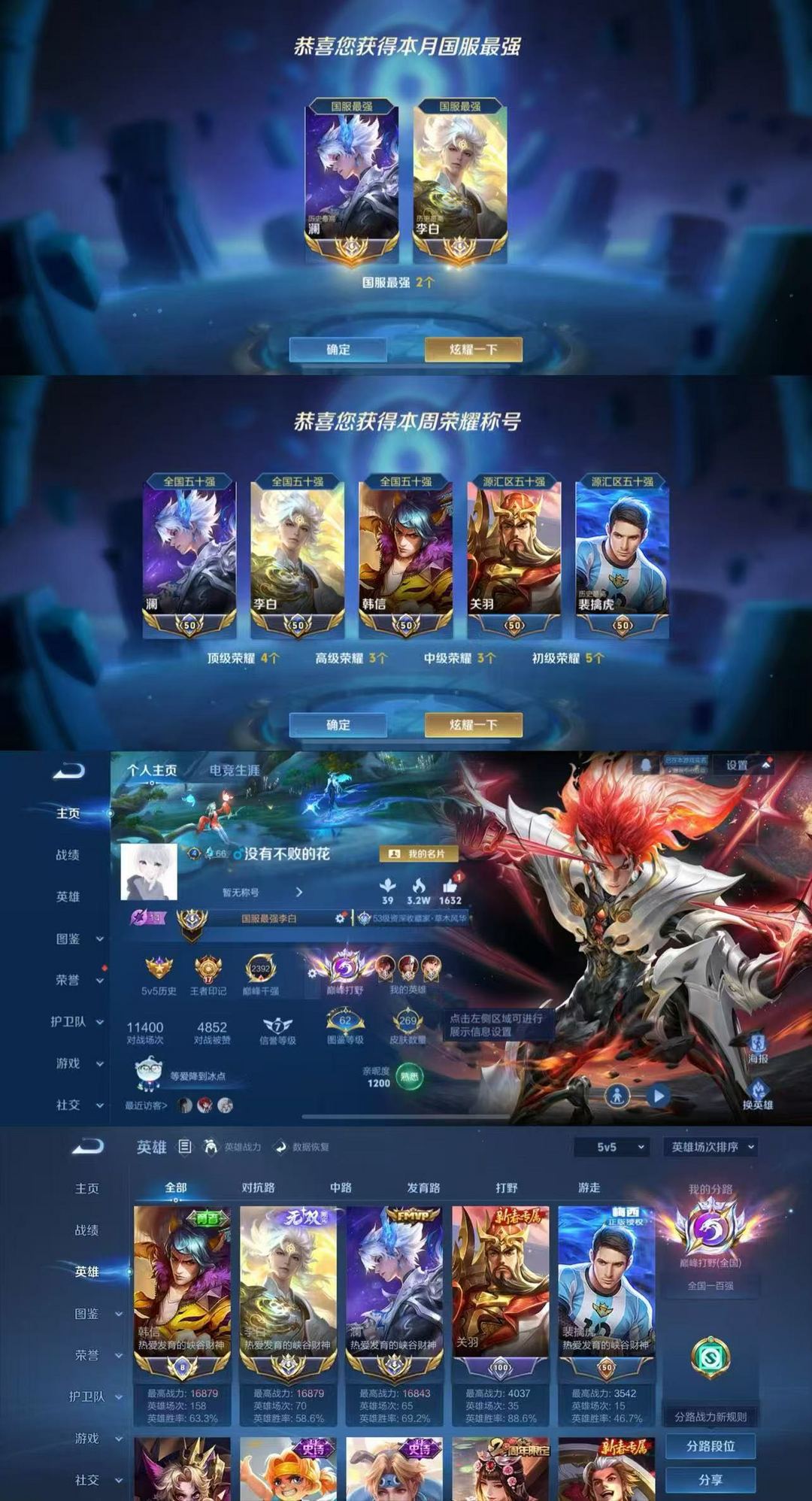 3月正式服在榜双国服李白澜⭐巅峰2390千强框⭐无双限定皮⭐超多省级限定皮肤⭐