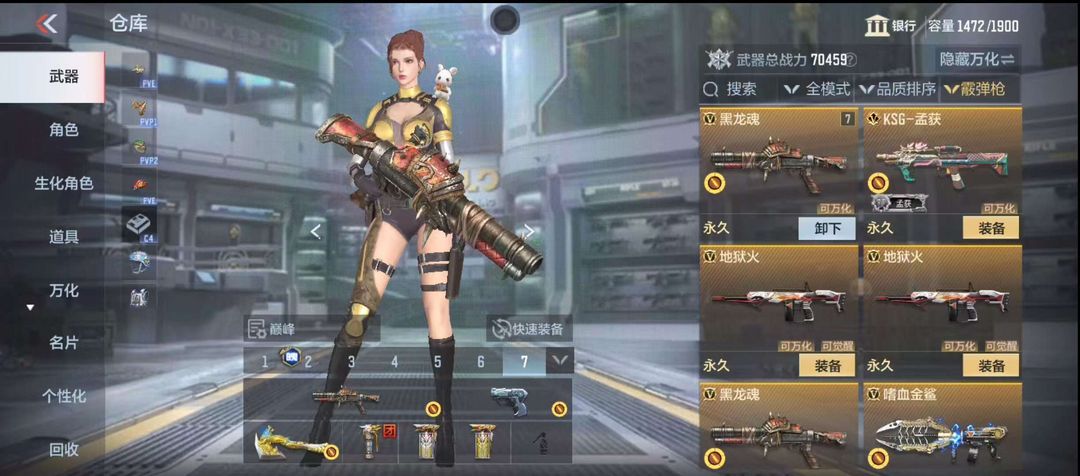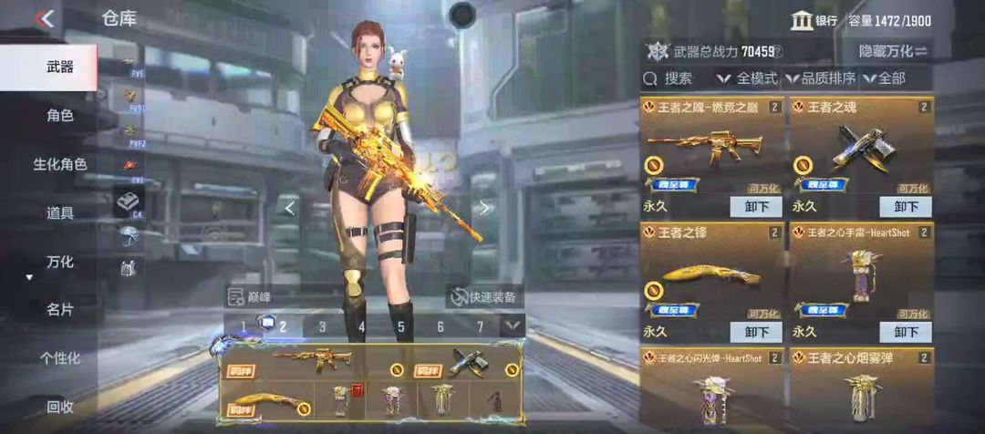 装备描述:破至尊心至尊怒至尊。王者之翼,王者之心,王者之力,王者之怒,王者之锋,王者之啸。王者之戮,星象套装,奉先。黑龙魂。 M 4a1游骑兵。 Ak47游骑兵
