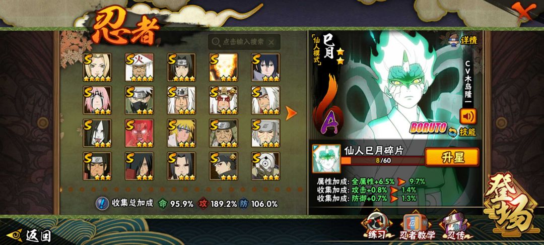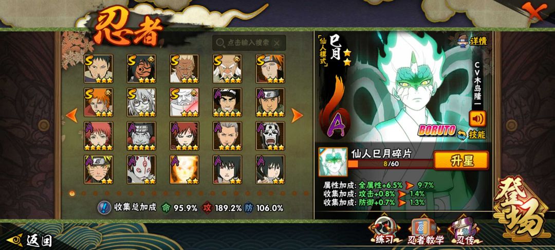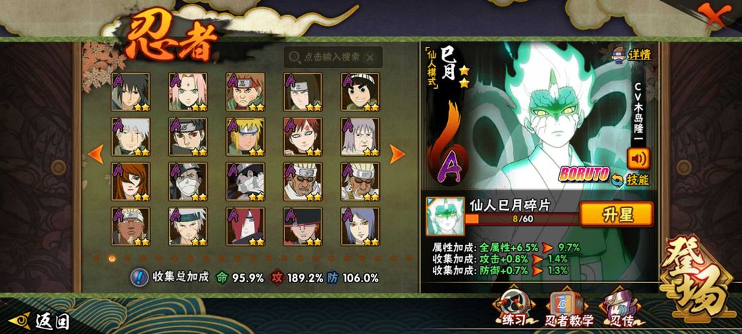 装备描述:自来也,秽土再不斩,忍战大野木,漂泊佩恩,艾,青水等等好玩忍者