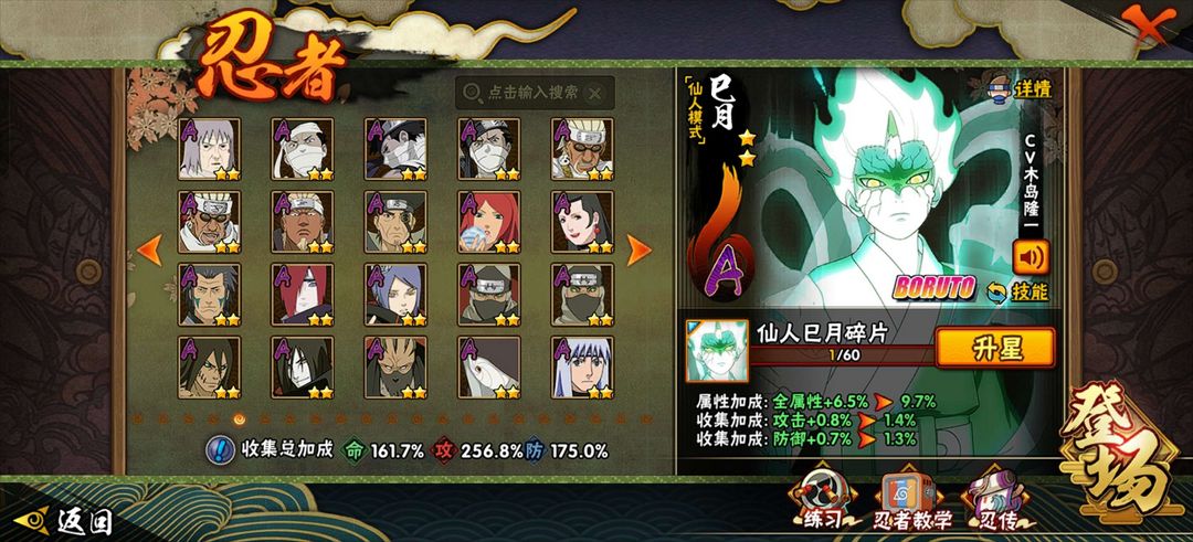 装备描述:九喇叭水门 须佐止水 须佐卡卡西 绯流琥蝎 忍战李 漂泊再不斩 暴怒带土 新春止水 桃式博人 解斑 永恒佐助 忍战带土 天道超 通灵有蛞蝓熊猫二尾