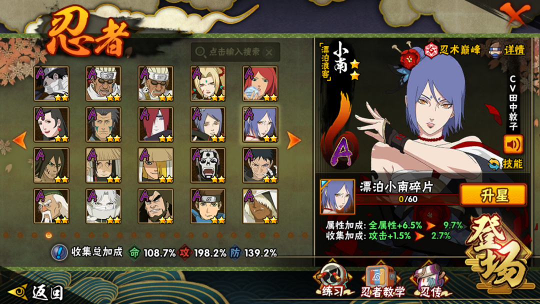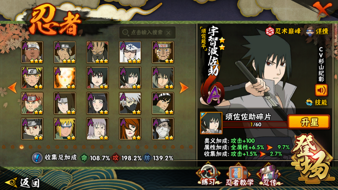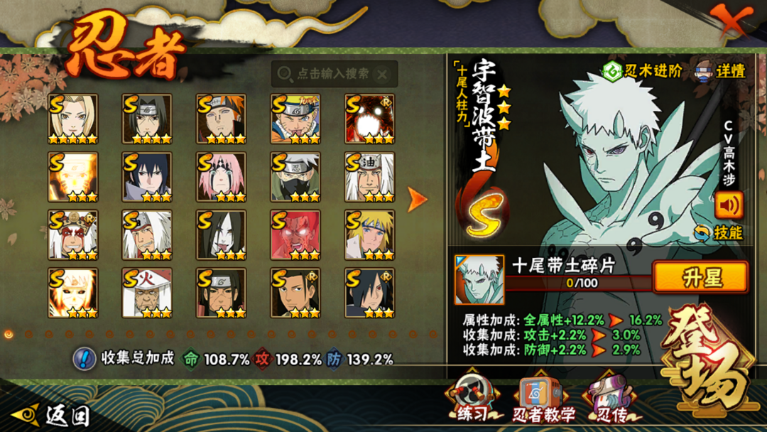 装备描述:春野樱 「忍界大战」;大筒木金式;千手柱间 「秽土转生」;宇智波佐助 「永恒万花筒」;佩恩 「天道」;自来也;宇智波带土 「忍界大战」;大蛇丸;神秘面具男 「红夜之刃」;宇智波斑 「秽土转生·解」;千手柱间
