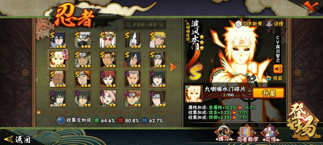 装备描述:有金身水门,秽土再不斩,须佐卡卡西,老三代,忍战艾,舞之豪杰自来也,天道佩恩,须佐鼬,百战水门,大蛇丸,解斑,紫狗,创立柱间,普通人,青年水门,万花筒佐助,须佐