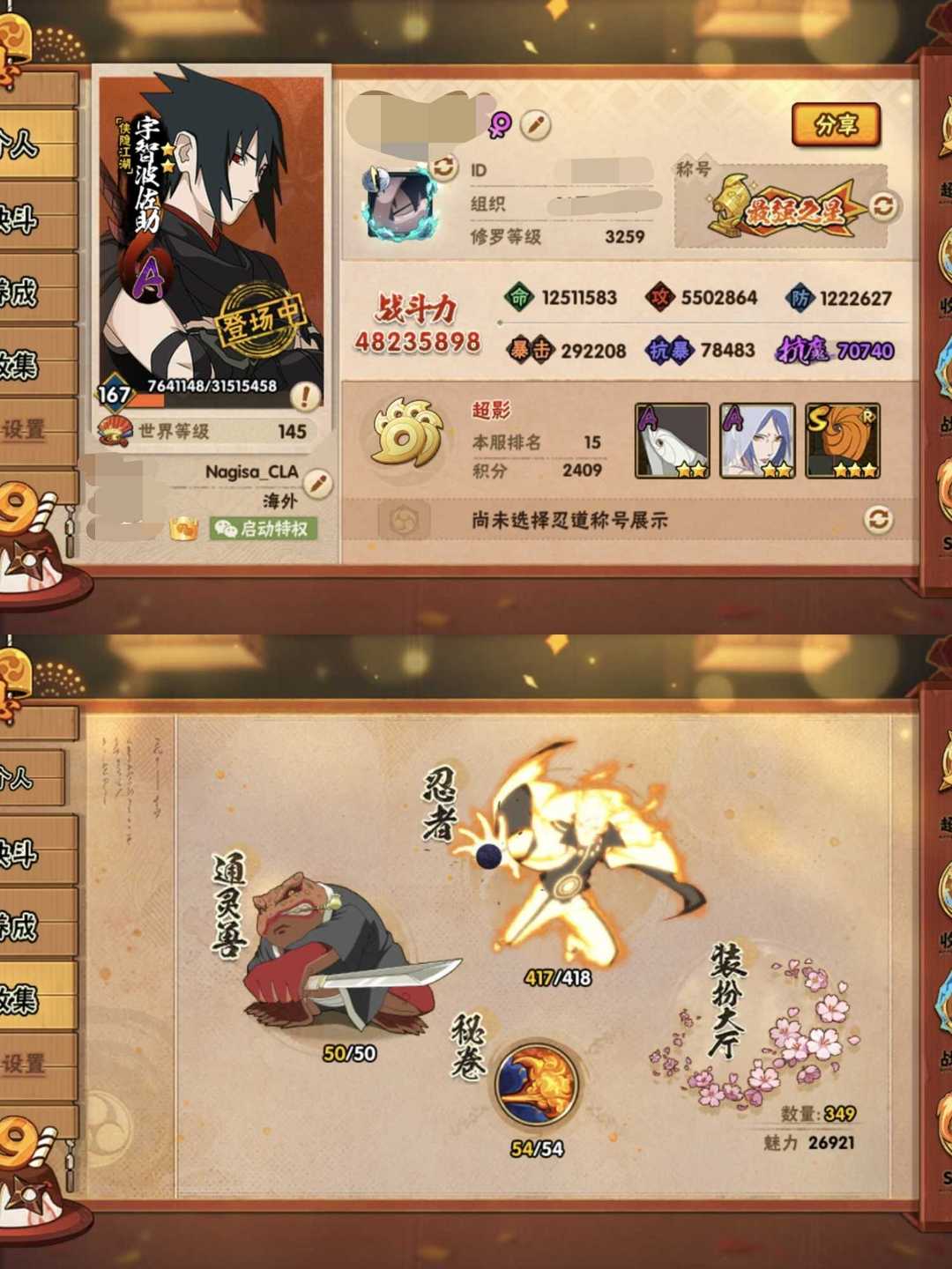 十尾带土❤️4855w顶配❤️3100属攻秒杀团本❤️全忍者❤️全通灵❤️侠隐佐助❤️看描述可便宜租