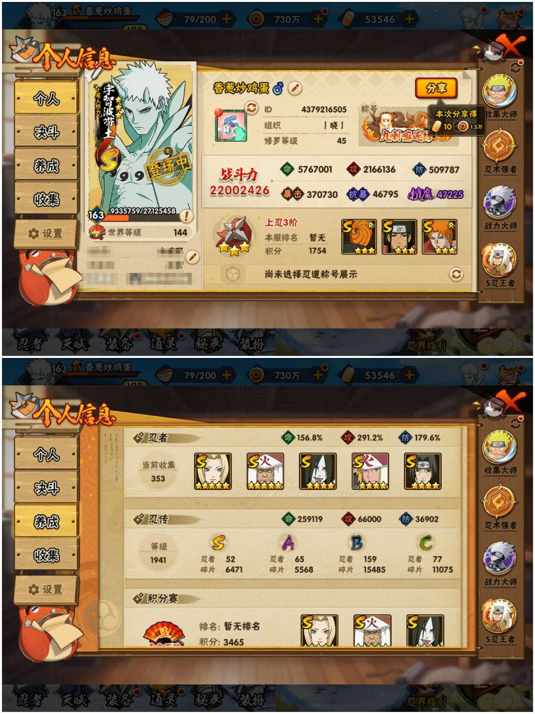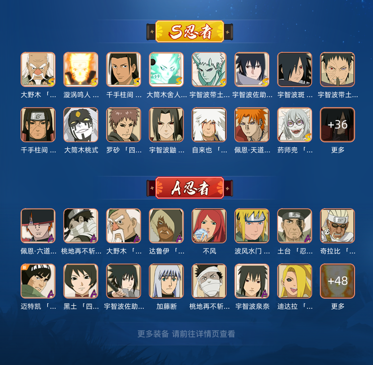 限制: 撤单率<40%才可租用此帐号装备描述:S忍者:【大野木 「忍界大战」,漩涡鸣人 「九喇嘛连结」,千手柱间 「木叶创立」,大筒木舍人 「最终章」,宇智波佐助 「永恒万花筒」,宇智波斑 「木叶创立」,宇智波带土 「忍界大战」,千手柱间 「秽土转生」,大筒木桃式,罗砂 「四代目风影」,宇智波鼬 「秽土转生」,自来也 「舞之豪杰」,佩恩·天道 「超」,药师兜 「仙人模式」,宇智波斑 「秽土转生」,艾 「三代目雷影」,“宇智波斑” 「白面具」,半藏 「秽土转生」,千手扉间 「秽土转生」,纲手 「百豪」,无 「二代目土影」,宇智波斑 「五影会谈」,漩涡鸣人 「暴怒·第六尾」,宇智波止水 「须佐能乎」,艾 「忍界大战」,自来也 「传说中的三忍」,艾 「四代目雷影」,波风水门,波风水门 「秽土转生」,大蛇丸,纲手,鬼灯幻月 「二代目水影」,金角银角 「秽土转生」,佩恩 「天道」,千手扉间,千手柱间,神秘面具男,宇智波斑,宇智波鼬 「须佐能乎」,猿飞日斩,猿飞日斩 「秽土转生」,长门 「秽土转生」,自来也,神秘面具男 「红夜之刃」,宇智波斑 「秽土转生·解」,春野樱 「忍界大战」,大筒木金式,波风水门 「九喇嘛连结」,旗木卡卡西 「须佐能乎