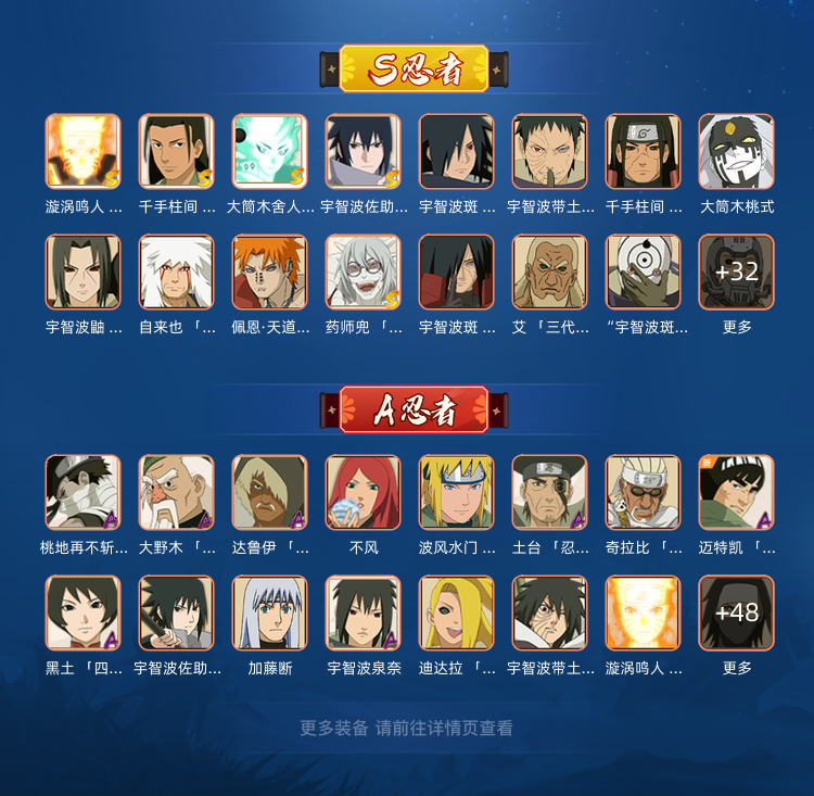 装备描述:48S✨65A✨340忍✨金身水门✨五影会谈斑✨传说自来也✨2650w战力可带团本打段位