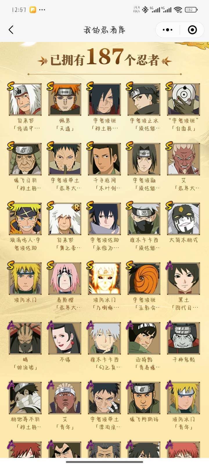 装备描述:19S/41A⭐漂泊带土⭐破面带土⭐暴怒带土⭐忍战雷影⭐五影会谈班⭐一千零五十万战力⭐仙人巳月 不毁号