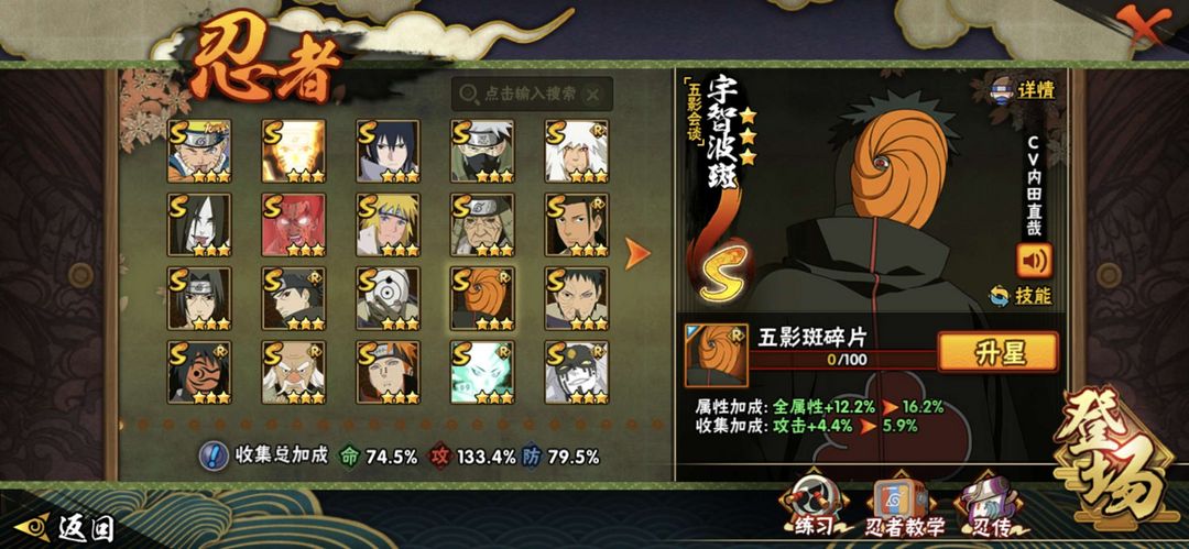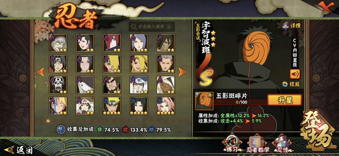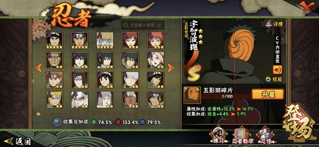 有20个s忍者 37个a 194个忍者 五影会谈带土 白面具创立柱间等强力忍者如下图 1200万战力