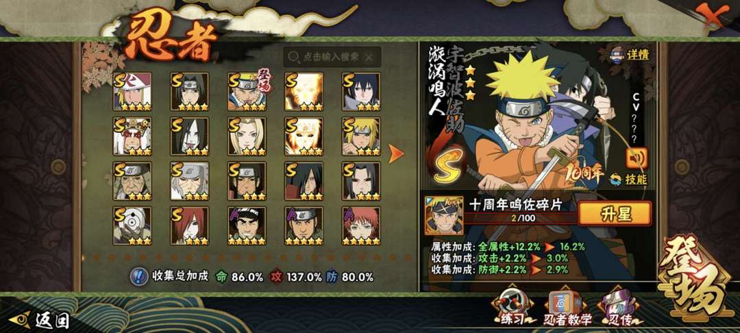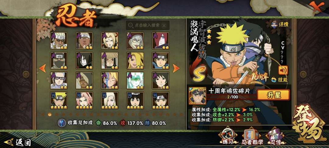 装备描述:段位可打 秽土五影都有 鸣人形态基本都有 秽土水门 金身水门 疾风咒佐