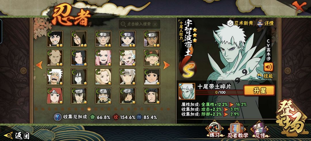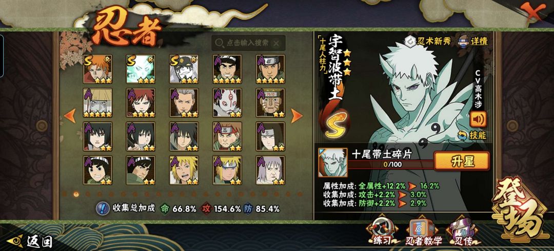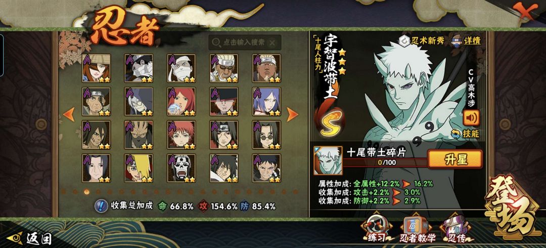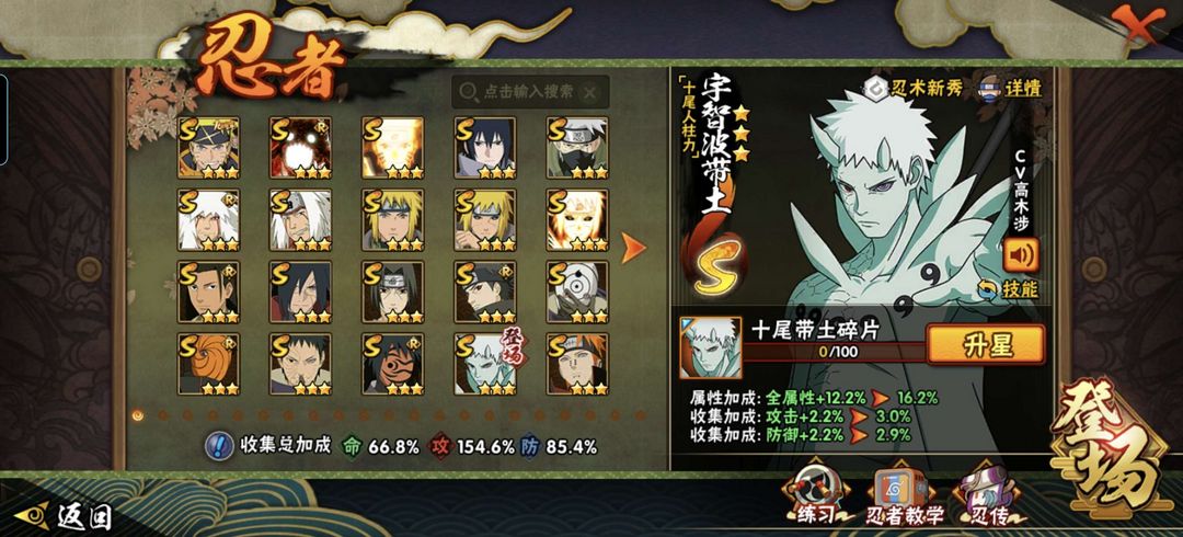 带土(破面,漂泊,十尾,白面具,忍法帖*2),天道超,水门(秽土,金身,新春,百战),九喇嘛,忍法帖