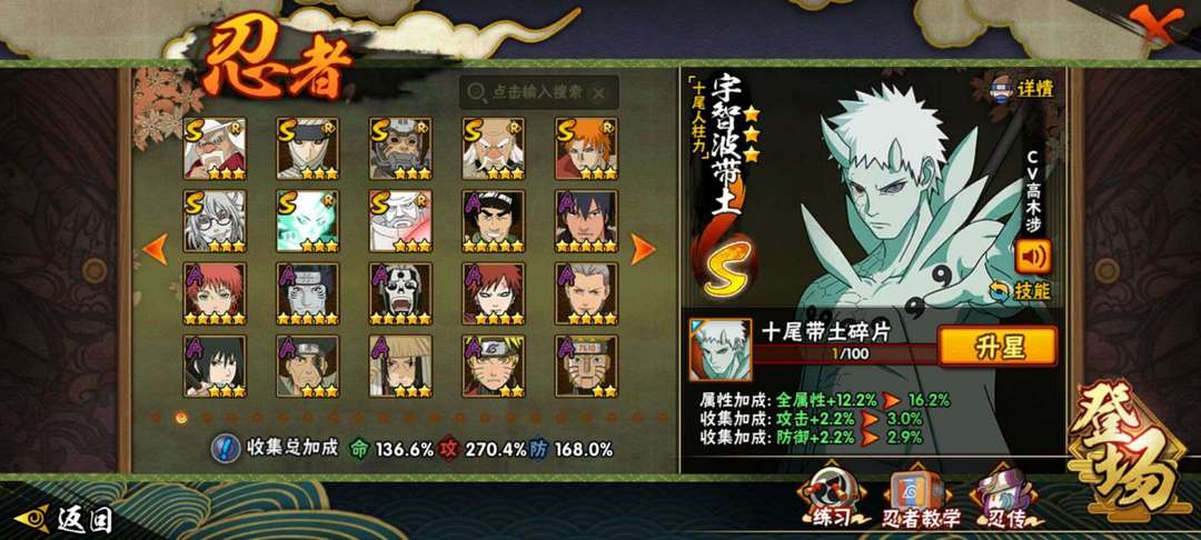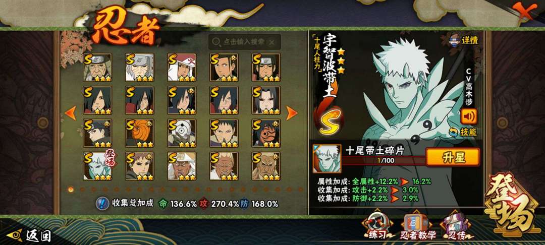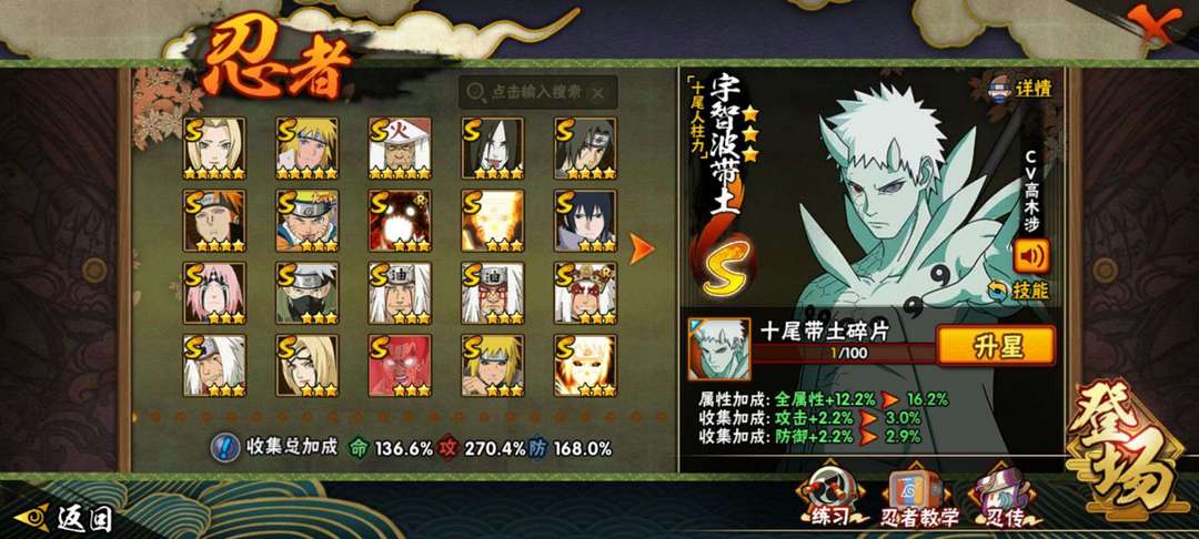 装备描述:十尾带土、百豪纲手、秽土水门、秽土扉间、柱间、秽土斑、秽土鼬、白面具、四代风影、三代雷影、大野木、二代土影无、半藏、天道超、仙人兜