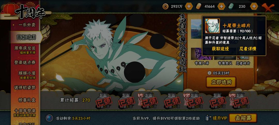 1500万战力,十尾带土体验卡242个忍者30s48a,大筒木舍人,大筒木桃式,须佐卡卡西,忍战带土