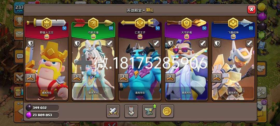部落冲突,17本满防,五王全满有皮肤,高科技,117繁荣度,237级。上不了号加我威.给你通过。