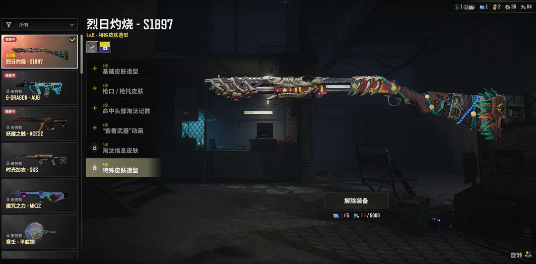 ④级烈日灼烧S1897✅暗影缠身AKM✅毒液M762✅灵魂枷锁AKM✅幸运骑士SKS✅完美角度98K