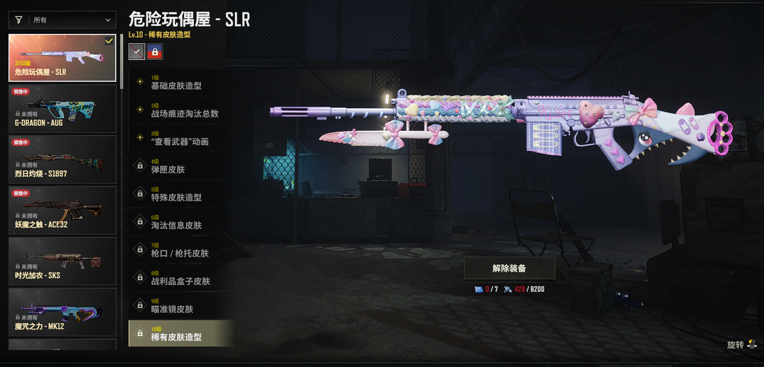 ③级危险玩偶屋SLR✅灵魂枷锁AKM✅金色落叶SKS✅青花之力mini✅彩虹蛋糕莫辛纳甘✅幸运骑士M