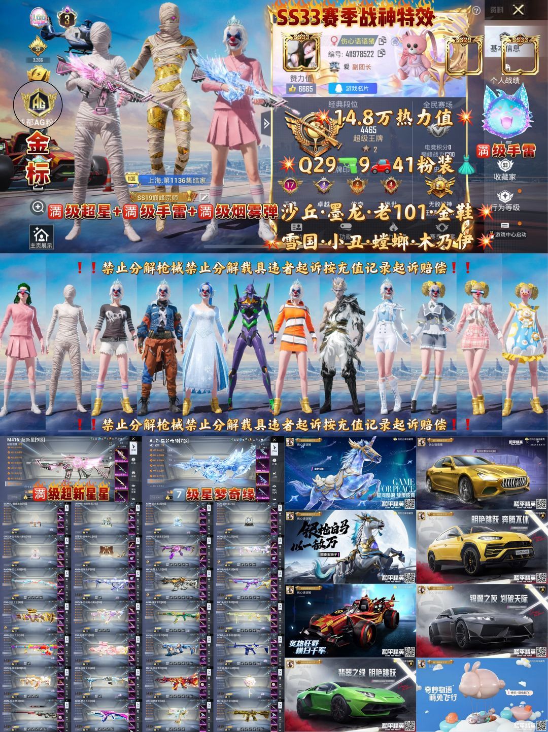 限制: 租号12次及以上 | 撤单率<50%才可租用此帐号装备描述:>>>>>>毁号,涉及毁坏虚拟财产罪及计算机安全罪,请文明游戏素质游戏,让我们共建美好租号平台>>>>>> 本游戏账号:特效枪数量13个,粉装数量41套,载具数量5个,优质装备有: AKM-梦之光华, SCAR-L-童趣迷兔, M416-风花雪月, M416-五爪金龙, 套装-怪诞乔克, 套装-甜心巧克力, 套装-宝贝奶油派, 套装-天使彩虹糖, 套装-雪国幻梦, 套装-梦幻火箭, 套装-缤纷油彩, 套装-放客神游, 甜心宝贝降落伞, 神秘黑猫降落伞, 风花雪月降落伞, 兰博基尼URUS(明艳黄), 玛莎拉蒂Ghibli(金), 兰博基尼Estoque(银翼灰), 兰博基尼Aventador SVJ(翡翠绿), 甜蜜菠萝头盔(3级), 童趣迷兔头盔(3级), 暗夜玫瑰头盔(3级)等,供您畅选,感受良好游戏体验! 注意事项: A.游戏过程中请不要恶意挂机或者不文明发言 B.恶意挂机、顶号等行为将被拉黑无法再次下单 C.进入游戏后中途请勿退出登陆,否则无法再次上号 D.部分账号由于异地登录可能会出现密码错误提示,通常再尝试5-6次后可上号 |||||||||喜欢本账号请点 ☆收藏☆ 方便下