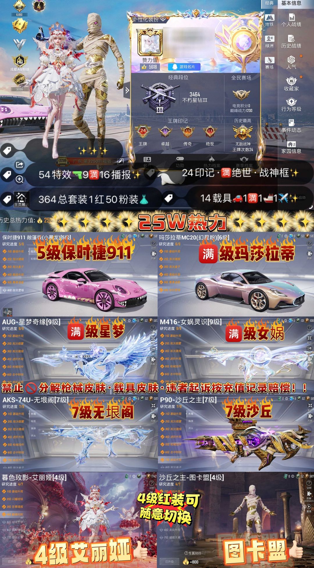 限制: 租号15次及以上 | 撤单率<60%才可租用此帐号装备描述:✔️游戏中途弹人 链,重新启动游戏即可。 !!禁止拆解枪械载具违者拉黑起诉!! 订单问题由平台客服处理,号主无权处理,有问题咨询平台客服 请勿伤害队友,如造成禁麦禁言,拉黑处理,请文明游戏。 ❌严禁开挂,恶意组队!【此号累计充值15万】使用外挂以及任何第三方软件导致账号封禁将由你本人承担一切法律责任《封禁按照累计充值起诉》《分解枪械载具照价起诉赔偿》不要以为用虚拟手机号,虚拟机,盗窃他人资料实名就找不到你,只要是你做过的任何事情在大数据面前是无处可逃,网络不是法外之地且行且珍惜!!