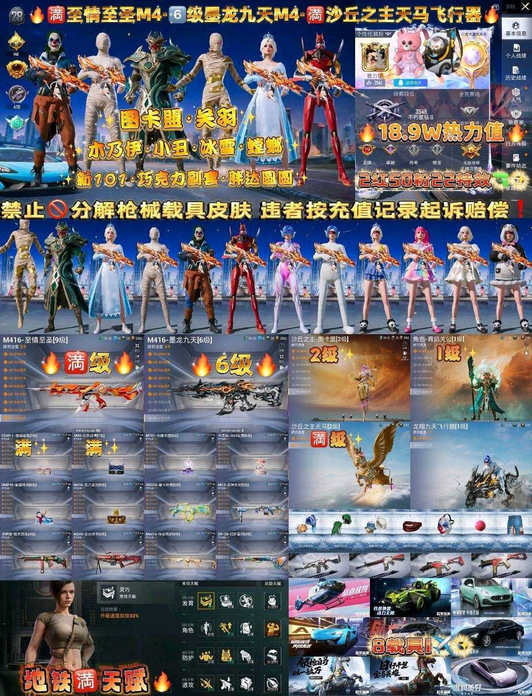 满级至情至圣✨战神框2级图卡盟关羽✨小丑雪国红螳螂木乃伊✨星际m4墨龙m4✨粉熊背包