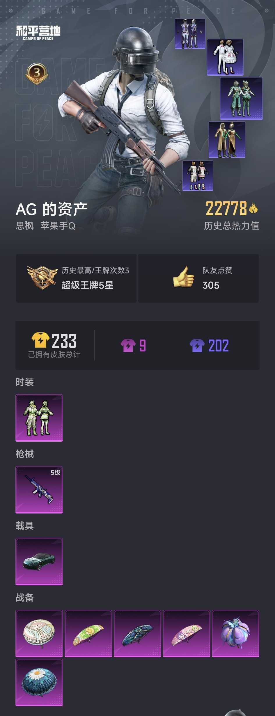 装备描述:和平多粉装❤️阿斯顿马丁车❤️5级枪皮❤️多粉装皮