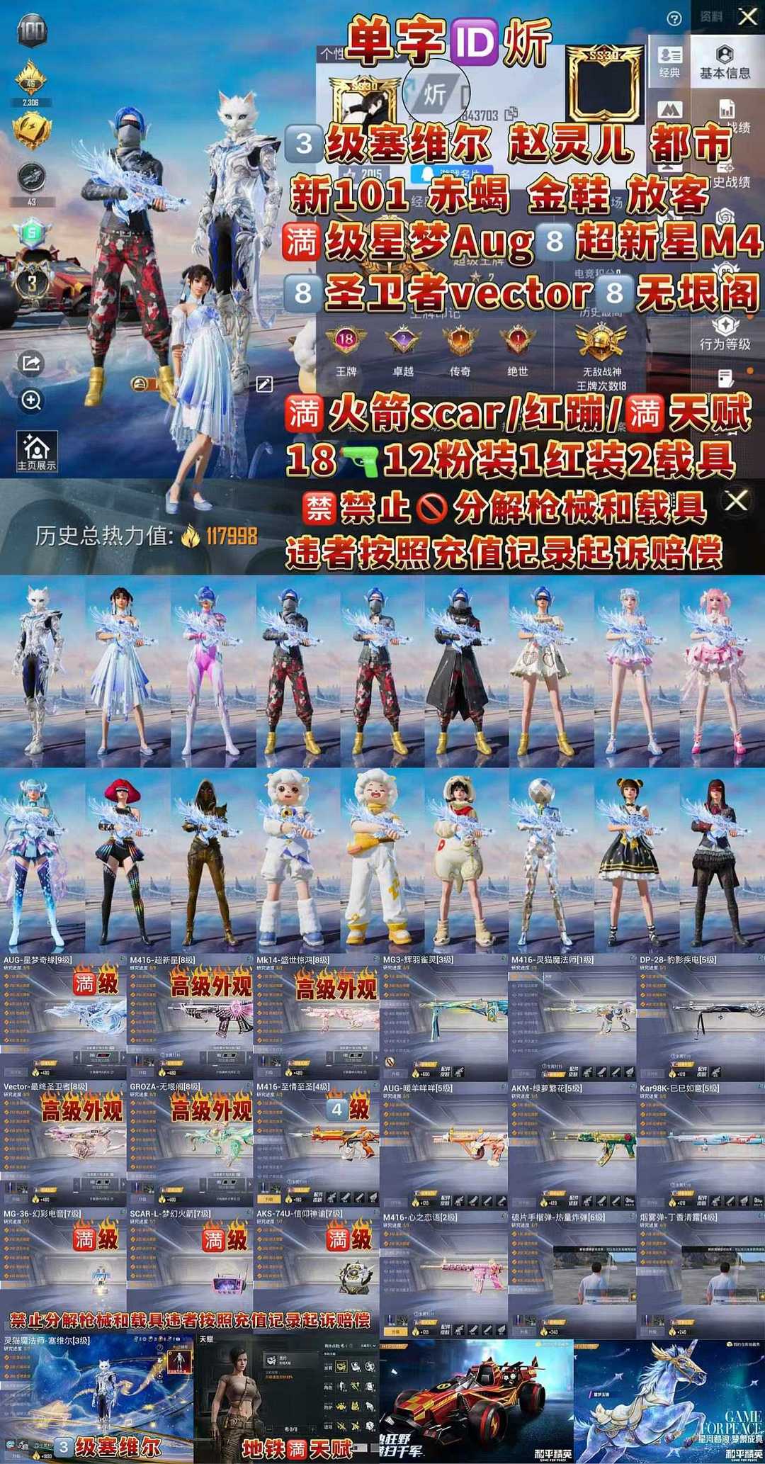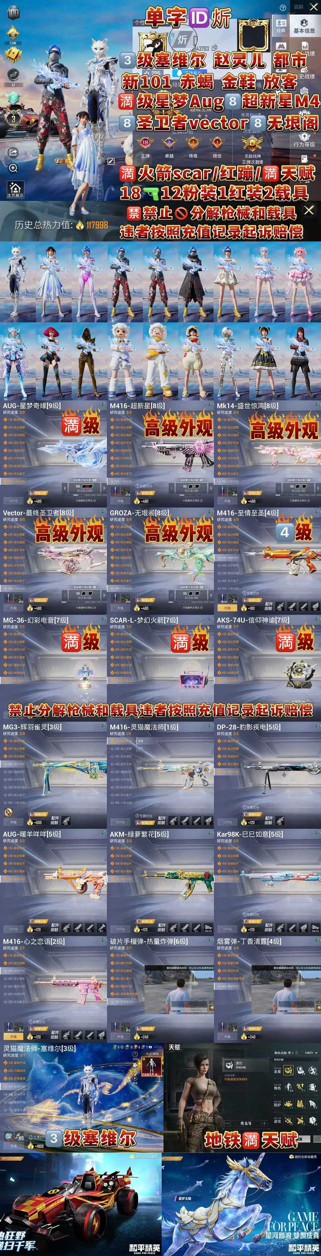 限制: 租号20次及以上 | 撤单率<60%才可租用此帐号装备描述:毁号,涉及毁坏虚拟财产罪及计算机安全罪,请文明游戏素质游戏,让我们共建美好租号平台 本游戏账号:特效枪数量8个,粉装数量11套,载具数量7个,优质装备有: AKM-甜心宝贝 SCAR-L-童趣迷兔 M416-心之恋语 AUG-星之彼岸 Vector-环太平洋 MG3-洛神天依 套装-怪诞乔克 套装-甜心巧克力 套装-宝贝奶油派 套装-天使彩虹糖 套装-梦幻火箭 套装-缤纷油彩 套装-新星烈龙 套装-冰霜白皇 套装-星之彼岸 齐天大圣降落伞 梦幻火箭降落伞 童趣迷兔降落伞 甜心宝贝降落伞 暗夜玫瑰降落伞 星之彼岸降落伞 蓝莓炮弹降落伞 合金龙骨(绿) 兰博基尼URUS明艳黄 童趣迷兔头盔3级 虎虎生威头盔3级 星之彼岸头盔3级等,供您畅选,感受良好游戏体验! 注意事项: A.游戏过程中请不要恶意挂机或者不文明发言 B.恶意挂机、顶号等行为将被拉黑无法再次下单 C.进入游戏后中途请勿退出登陆,否则无法再次上号 D.部分账号由于异地登录可能会出现密码错误提示,通常再尝试5-6次后可上号毁号行为涉及毁坏虚拟财产罪及计算机安全罪,请文明游戏素质游戏,让我们共建美好租号平台!
