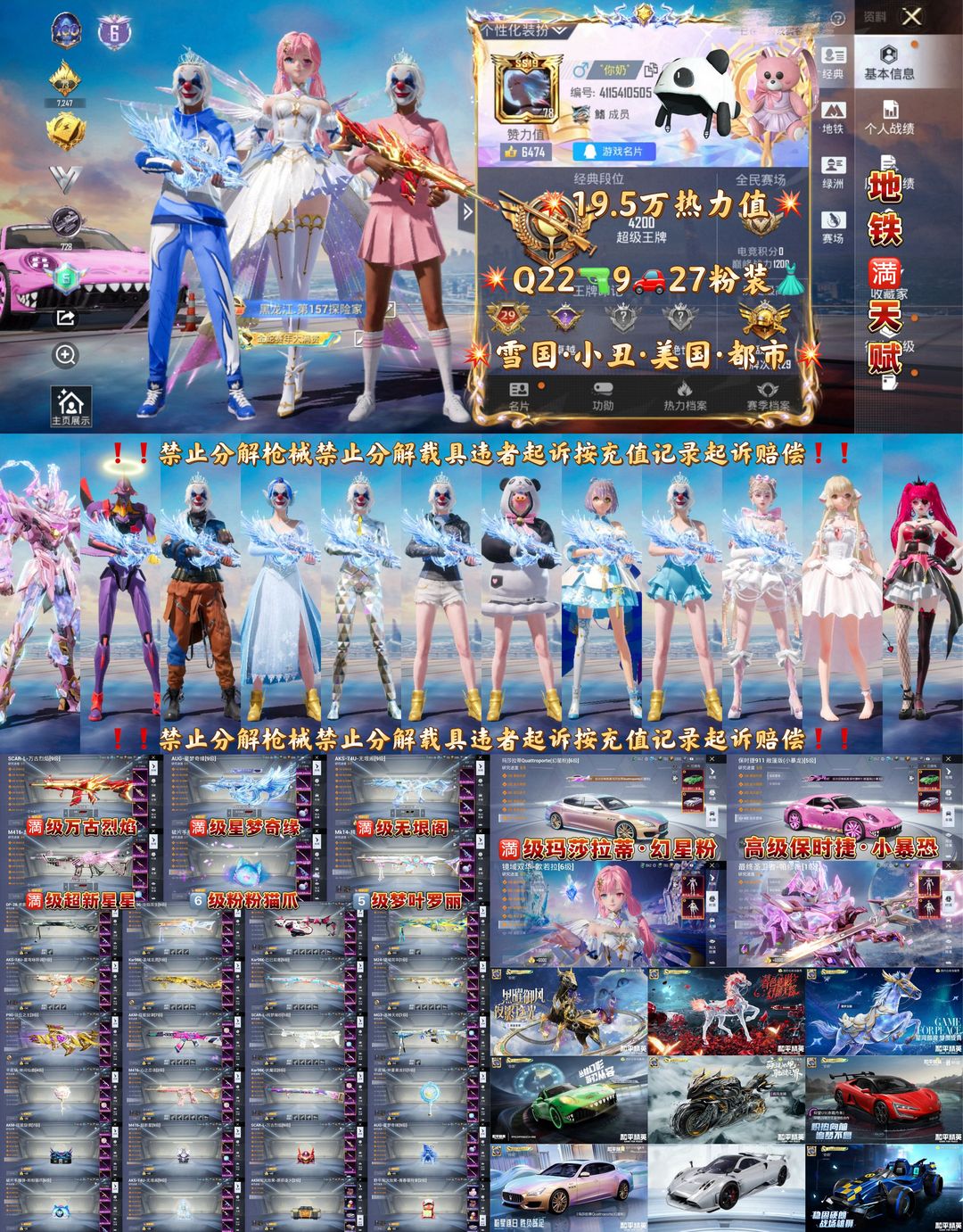 6级欧若拉美国人Agfox新老101雪国小丑/满级玛莎5级保时捷/4把满级特效枪星梦奇缘超新星M4