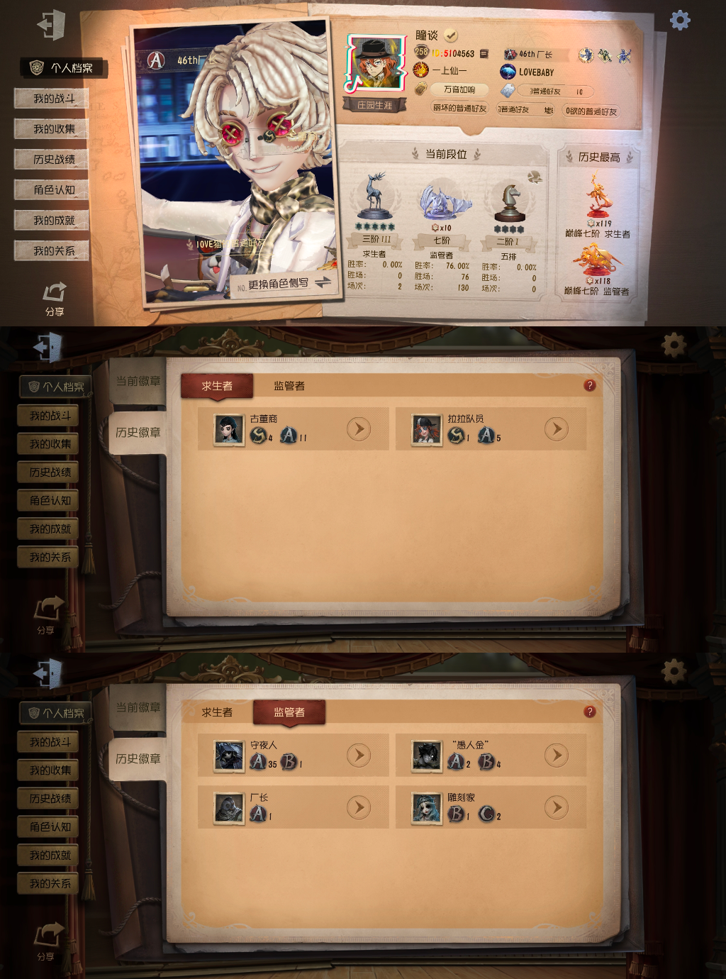 装备描述:宝宝请勿直拍禁止直拍 租D号W夹R绿G泡V泡I宝P 苹果/安卓双区可转端 现S前锋B佣兵B先知C幻灯师人榜40名国服S牌+双B牌+C牌4个在榜现牌 ︎ 历史S小女孩S勘探S佣兵S前锋S先知S古董S气象S医生S空军S幻灯师S厂长A击球A机械师历史双巅峰求生193星【人榜在榜S牌13个历史标 历史11S】( 175金皮百金大情号 满氪带山庄共享 ) 现S2调香A43杂技A21守墓现榜3个A牌 历史S园丁S杂技S囚徒S守墓A佣兵A记者A厂长B杰克历史双巅峰求生301星【人榜在榜双S牌8个历史标历史4S】( 百金情号 带山庄共享 ) 现C牌守夜人历史S杂技S厂长A守夜A杰克历史双巅峰监管125星4历史标 ( 百金情号 带山庄共享 ) 现B牌厂长历史标S古董S拉拉A守夜A愚人金B牌雕刻 历史人屠双百星5历史标 ( 百金情号 带山庄共享 ) 个人号出租欢迎有礼貌素质好的宝宝租号