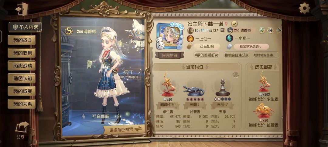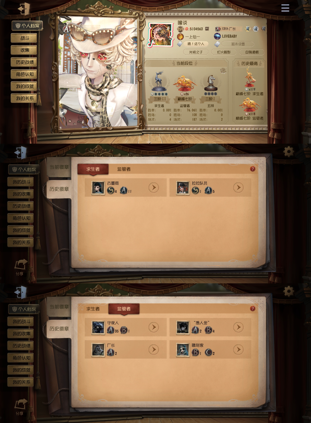 装备描述:宝宝请勿直拍禁止直拍 租D号W夹R绿G泡V泡I宝P 苹果/安卓双区可转端 现S4前锋人榜30名 历史S小女孩S勘探S佣兵S前锋S先知S古董S气象S医生S空军S幻灯师S厂长A击球A机械师历史双巅峰求生193星【人榜在榜S牌13个历史标 历史11S】( 175金皮百金大情号 满氪带山庄共享 ) 现人榜S2调香B拉拉 历史S园丁S杂技S囚徒S守墓A佣兵A记者A厂长B杰克历史双巅峰求生301星【人榜在榜双S牌8个历史标历史4S】( 百金情号 带山庄共享 ) 现C牌守夜人历史S杂技S厂长A守夜A杰克历史双巅峰监管125星4历史标 ( 百金情号 带山庄共享 ) 现A牌厂长历史标S古董S拉拉A守夜A愚人金B牌雕刻 历史人屠双百星5历史标 ( 百金情号 带山庄共享 ) 个人号出租欢迎有礼貌素质好的宝宝租号