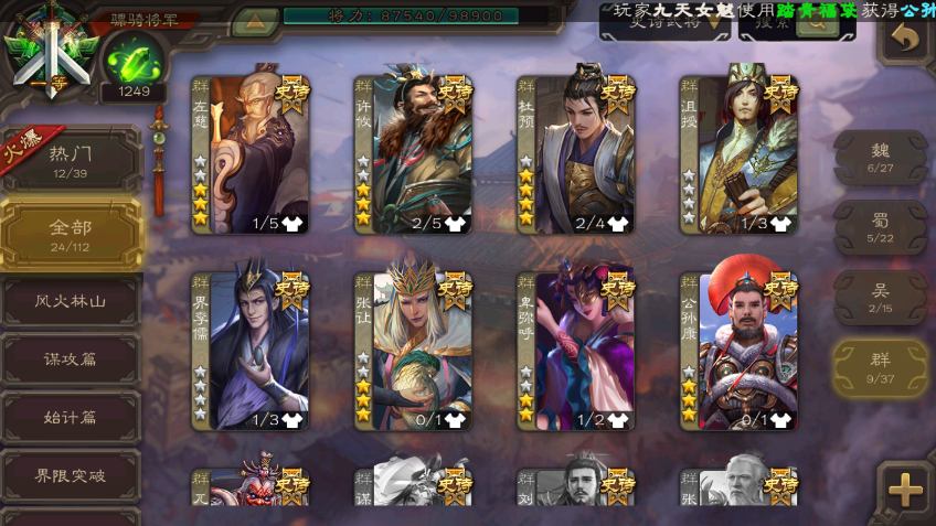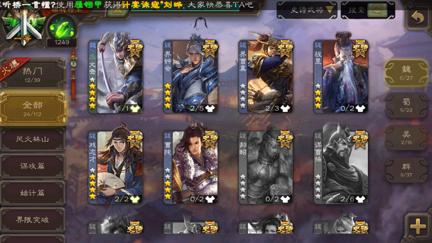 限制: 撤单率<80%才可租用此帐号装备描述:动态戏志才-郝昭-马云禄-关索-动谋孙策-骆统--麹义(白马)动神赵云