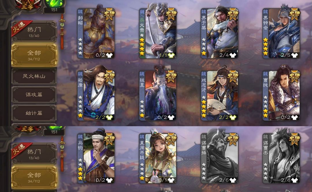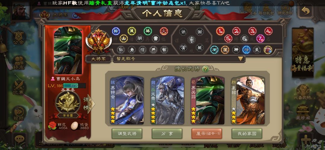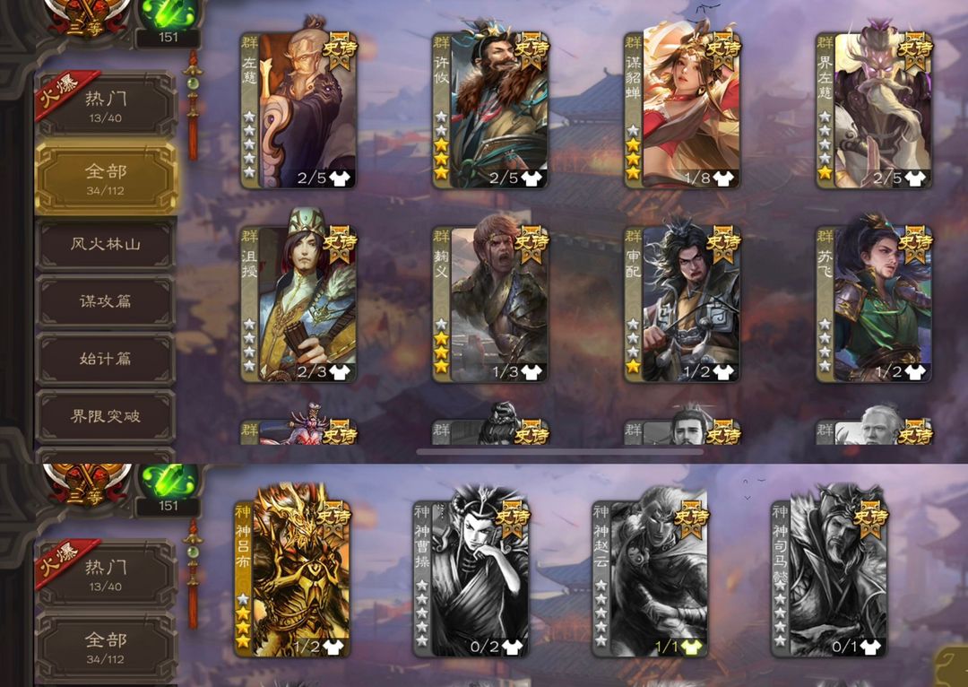 装备描述:官服个性有卡大将军。动态谋诸葛亮 势若万钧回廊文鸯 潜蛟窥天回廊界钟会 谋貂蝉 马钧 界左慈 界徐盛 动态戏志才 留赞 神吕布 白马 动态许攸等34史诗热门大将军,三卡充足。