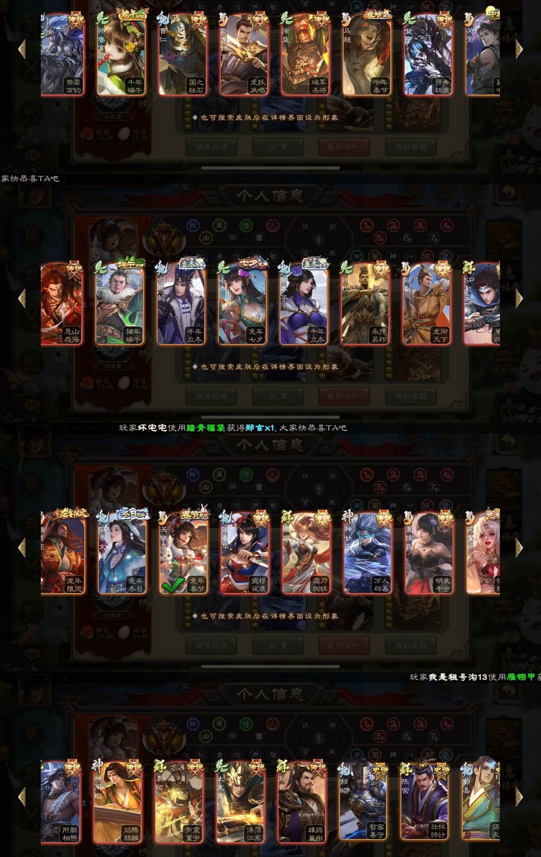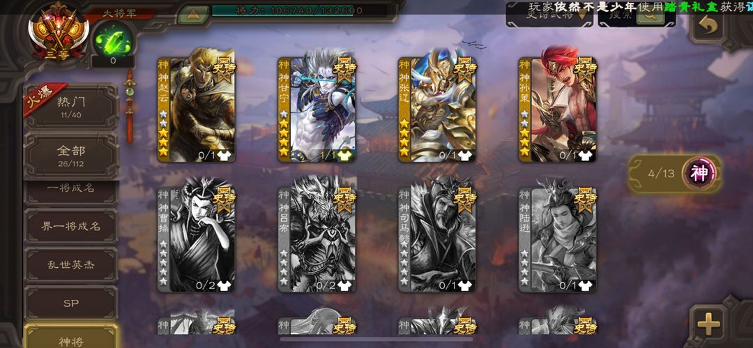 装备描述:官服个性有卡大将军。双动态谋诸葛亮 势若万钧回廊文鸯 动态神甘宁 回廊界徐盛大宝 神孙策 星周不疑 谋曹仁 神赵云 戏志才 谋赵云 白马 花蔓 多热门史诗有卡大将军