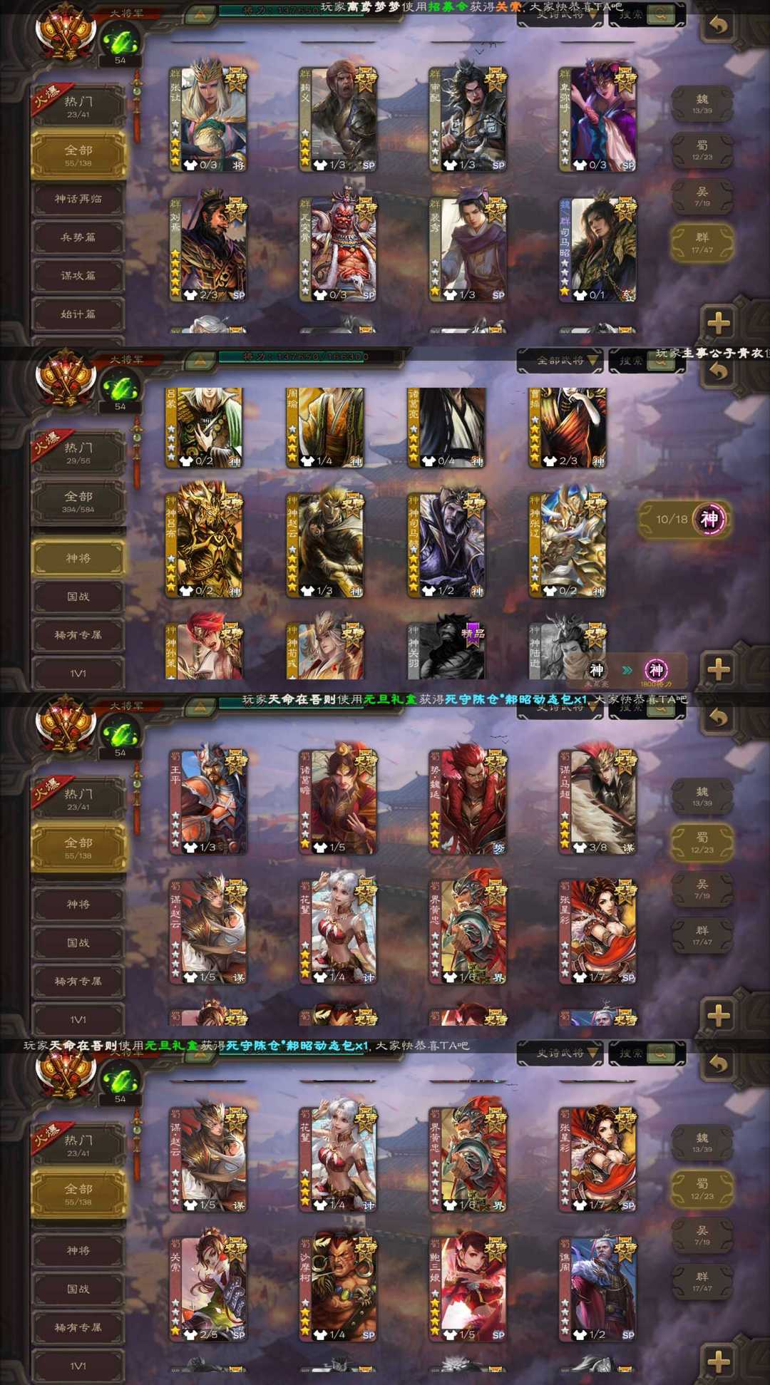 装备描述:四巨头二等大将军四方归心动态神曹操/动态刘焉/动态神司马懿/火龙果势魏延/动态鲍三娘/曹髦/势于吉/马钧/张奋/动态势陆郁生等55史诗