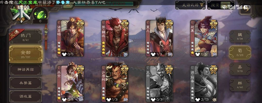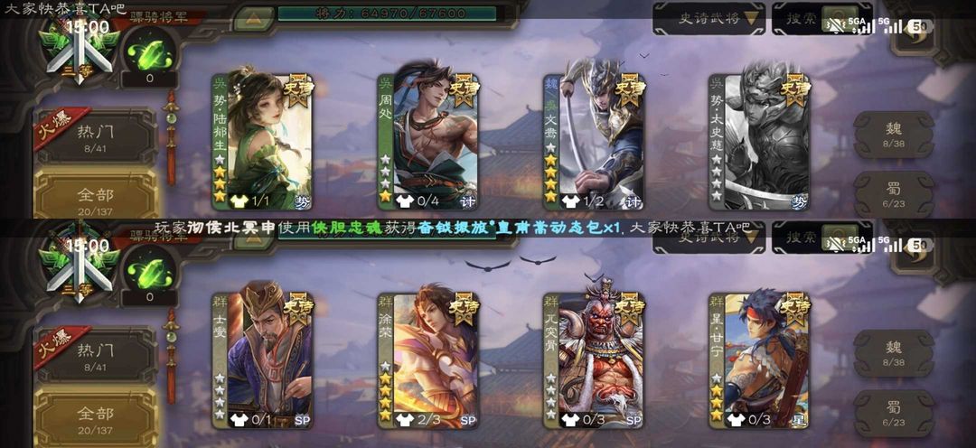 装备描述:有点将卡 枭龙破渊动曹髦 势魏延 双动徐荣 动文鸯 动势辛宪英 动势陆郁生 动清河公主 星甘宁 戏志才 周处 关索 沙摩柯 诸葛瞻