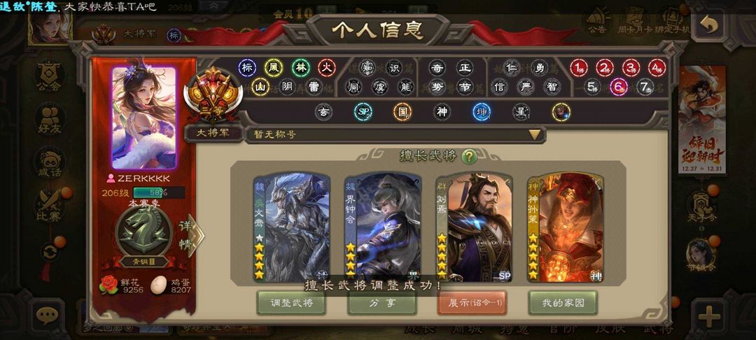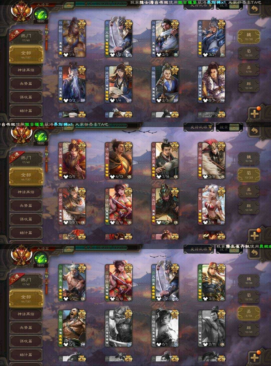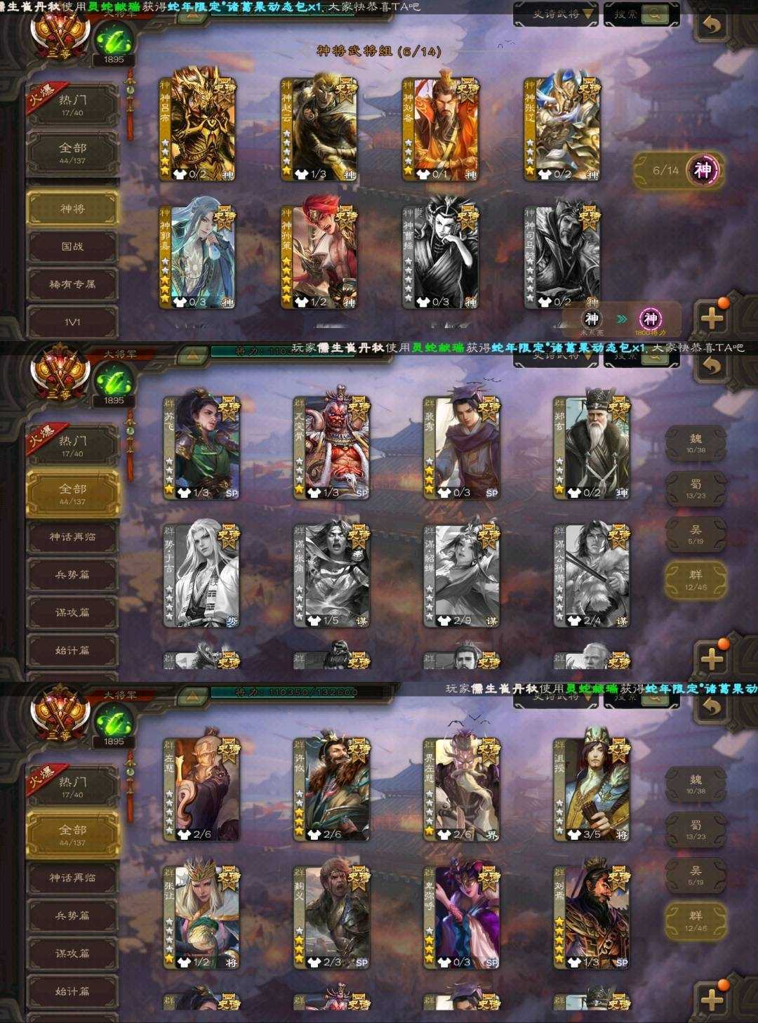 装备描述:魏国:⚡郝昭⚡文鸯⚡界于禁⚡界钟会⚡程昱⚡戏志才⚡陈琳⚡曹纯⚡马钧⚡⚡星周不疑⚡ 蜀国:⚡诸葛瞻⚡谋刘备⚡谋诸葛亮⚡谋马超⚡谋赵云⚡谋孙尚香⚡谋关羽⚡花鬘⚡界黄忠⚡张星彩⚡关索⚡沙摩柯⚡谯周⚡ 吴国:⚡谋黄盖⚡界徐盛⚡留赞⚡ 群雄:⚡左慈⚡许攸⚡界左慈⚡沮授⚡张让⚡麹义⚡卑弥呼⚡刘焉⚡苏飞⚡⚡兀突骨⚡裴秀⚡郑玄⚡⚡ 神将:⚡神吕布⚡神赵云⚡神刘备⚡神张辽⚡神郭嘉⚡神孙策⚡ 排位:90 国战:90 势若万钧-文鸯 潜蛟觊天-钟会 明良千古-孙尚香 破军杀将-徐盛 扬刀立威-麹义 雄踞益州-刘焉 霸王在世-神孙策