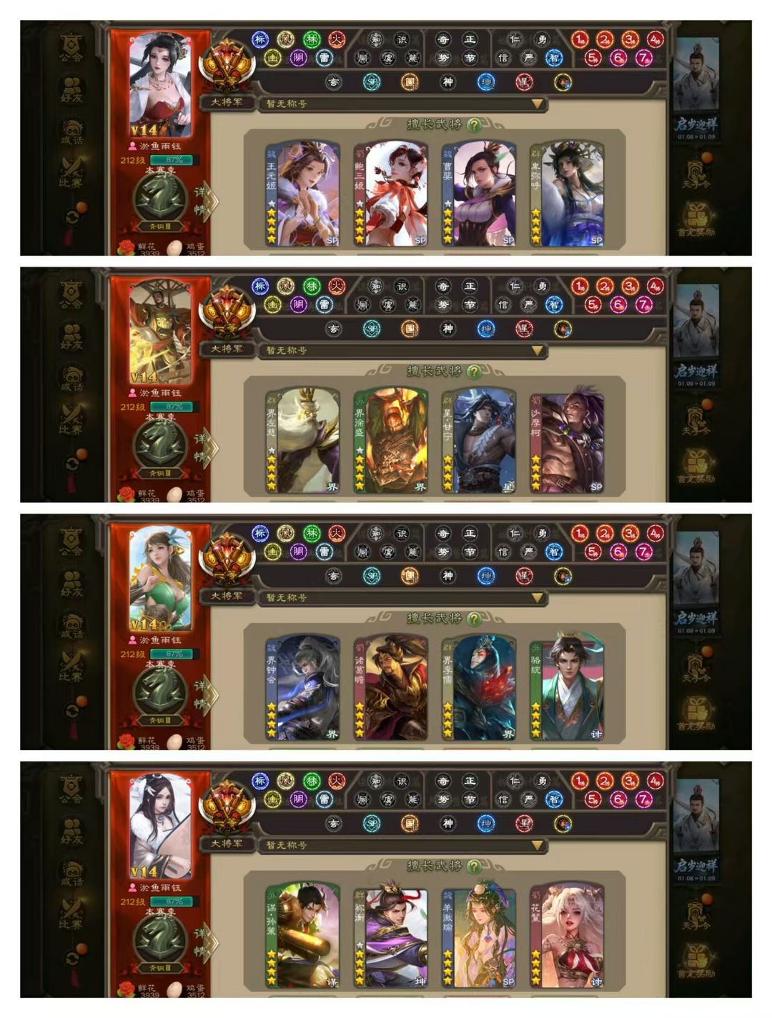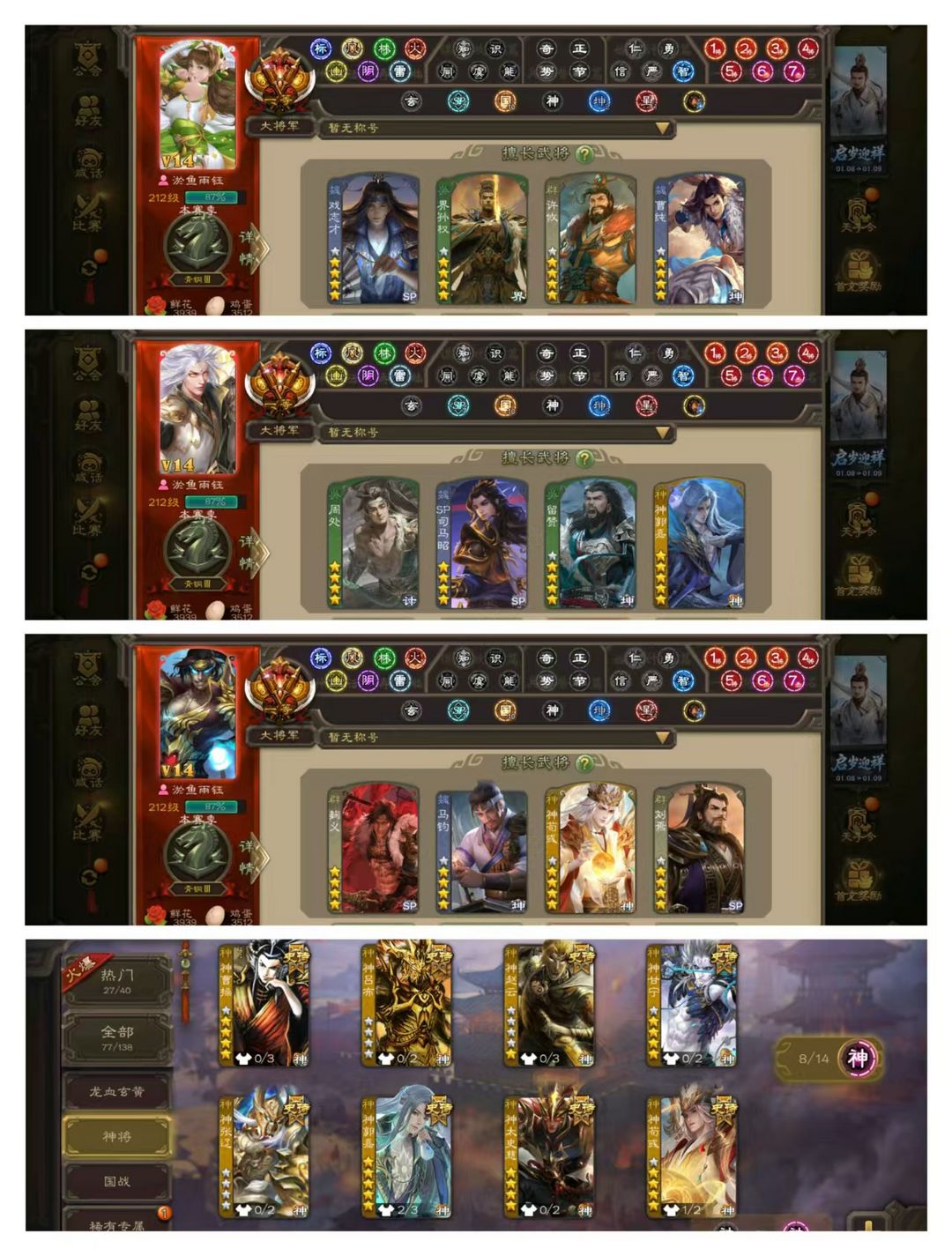 限制: 撤单率<19%才可租用此帐号装备描述:官方一等大将军,有卡有豆,VIP14! 1五星炎龙:双形态至尊动神郭嘉! 35四星玉龙:双形态至尊动界钟会,手办动鲍三娘,回廊动界徐盛,回廊动聚义,回廊动卑弥呼,回廊动诸葛瞻,动刘焉动神荀彧动谋孙策动花鬘,动界李儒动星甘宁动留赞动曹婴,动王元姬动界左慈动戏志才动周处,金马钧金祢衡金骆统金羊徽瑜,神曹操神甘宁阎象! 138排位武将,73动皮160金皮!