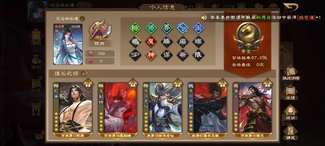 限制: 撤单率<30%才可租用此帐号装备描述:16大16小 魔貂蝉(动)老仙(动)祢衡(动) 16大:魔貂蝉 郭照 薛灵芸 潘淑 冯方女 曹爽 周处 曹纯 徐荣 曹宪曹华 卧龙凤雏 曹英 张琪瑛 费祎 袁谭袁尚 族钟啖(只缺关索三娘蒋琬) 族荀谌 族杨彪 族钟会 藤芳兰 界徐盛 吕伯奢 丙基 杨仪 王蓉 胡金定 丁原 羊枯 左芬 花蔓 杨婉 刘辩 翻翻乐 :张华 夏侯玄 神张角 蒲元 族荀谌 其他强将:司马徽 丁妈 谋小乔 谋关羽 谋袁绍 谋太史慈 族荀采 族王凌 族王允 sp曹操sp刘备 谋庞统 杜夫人 董昭 黄承彦 闪张辽
