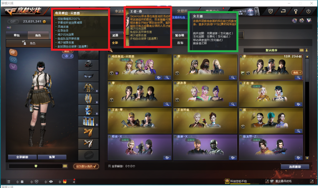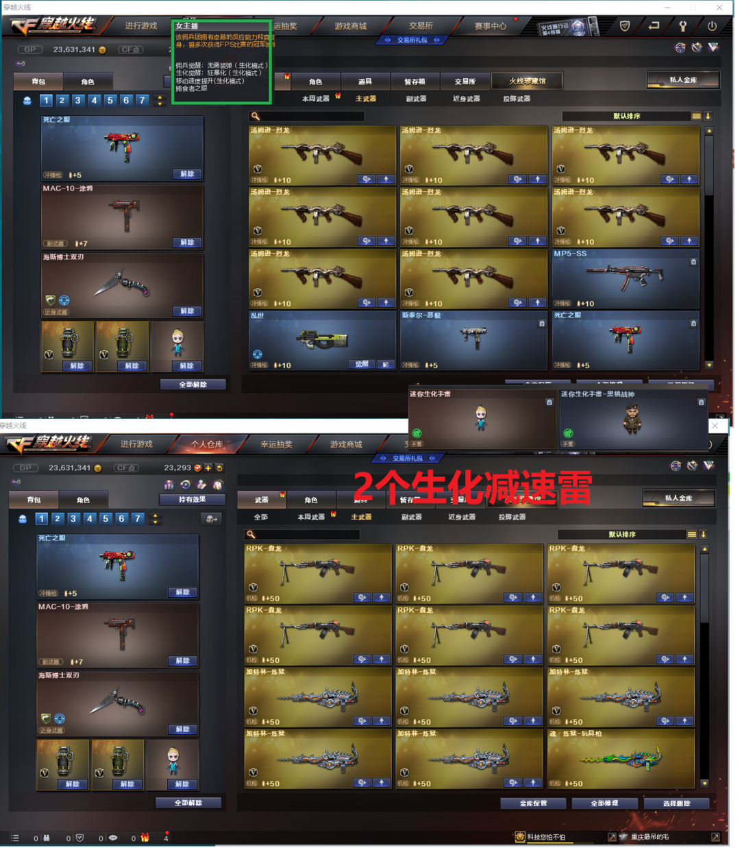 装备描述:排位:可以、、、、、生化四防全装(可以看生化僵尸血量):无需换弹、6烈、6盘龙、6炼狱、死亡之眼、MAC-远古神话、2个生化减速雷、超级对讲机、全部弹匣、、、、、、、、爆破四防:幻神、王者幻神、M200-竞技荣光、98K星神、USP雷暴、COP雷霆、2个柯尔特竞技荣光、幻兽沙鹰、传说光耀、白虎、QBZ金色蔷薇、、、雷神音效、毁灭音效、火麒麟音效、黑骑士音效、、、1套幻兽、3套雷霆、1套雷暴、3套夜魔、1套竞技荣光、、、、生化四防(女主播)爆破四防(云悠悠、王者春)