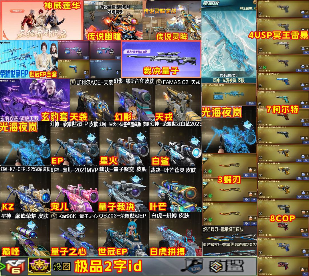 限制: 租号3次及以上 | 撤单率<50%才可租用此帐号装备描述:【装备道具】:传说影煞/神威莲华/传说辉光/传说夜影/传说暗裔(2)/传说幽瞳/传说梦魇/传说灵眸/传说圣灵/传说幽冥★幻神-光海夜岚/幻神-荣耀世冠EP/幻神-星火小队签名臻藏版/幻神-KZ-CFPLS25冠军/幻神-荣耀世冠白鲨2023/幻神-宠儿-2021MVP/幻神-冠军之幻/幻神-降龙/幻神-CFS2022/星神-巅峰荣耀/星神-破竹/裁决-量子聚变/裁决-叶芒苍灵/裁决-异化之源/AWM-裁决-百城联赛天津/金蚀-课桌奇兵/幻影-缪斯音盒/枪娘阿敏金色蔷薇-电竞之星/白虎-梅雀衔霜/白虎-拼搏/白虎-电玩粉兔/白虎-虎啸/QBZ03-荣耀世冠EP冠军之薇/世冠白鲨炽芒蝶刃-冠军炽芒/柯尔特-荣耀世冠EP/USP-冥王/柯尔特-荣耀世冠/98K-量子之心/加利尔ACE-天袭/FAMAS G2-天戎/玄豹★电竞装甲套装/堕天神套装/幻灵套/竞技荣光套装/荣耀世冠套装/雷暴套装/雷霆王者套装/云龙套装/玄豹套装/臻选金狐套装\\\\\\\\王者凌虎/王者星光/王者星霆/雷霆王者COP-堕天神/幻灵COP-云龙/USP-雷暴/USP-神工天巧/全音效卡/妮妮/智/枪娘樱/隼/机械姬/雨墨/荆棘