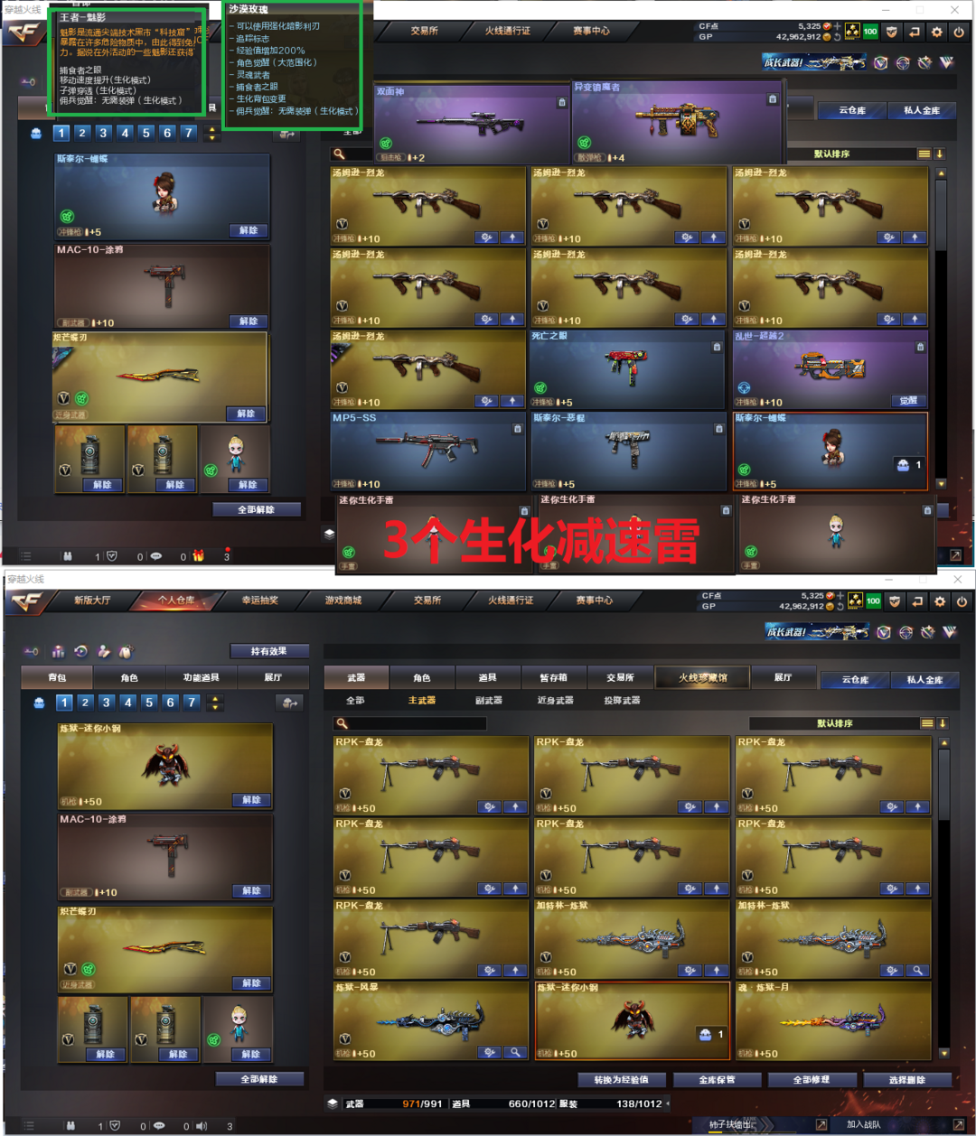 装备描述:排位:可以--------------生化四防(可以变更背包、查看生化僵尸血量):无需换弹、6烈6盘、炼狱、炼狱小刚、双面神、异变镇魔者、斯泰尔蝴蝶、死亡之眼、MAC手枪、炽芒蝶刃、3个永久减速雷、全部弹匣、、、、爆破全装:幻神音效(冠军之幻皮肤)、星神皮肤带音效、裁决音效、、、、USP雷暴、3个USP冥王、COP堕天神、COP雷霆、COP幻灵、COP雷霆王者、柯尔特竞技荣光、、、G36C幻影、白虎、QBZ蔷薇、玄豹白虎、、、、幻神音效、裁决音效、幻影音效、蔷薇音效、白虎音效、黑龙音效、毁灭音效、雷神音效、火麒麟音效、、、、6套雷霆、7套雷暴、1套堕天神、7套夜魔、2套幻灵、9套竞技荣光、、、、生化人物(沙漠玫瑰、王者魅影)、爆破人物(传说女帝、云悠悠、凌霄、玄豹、王者小乔)