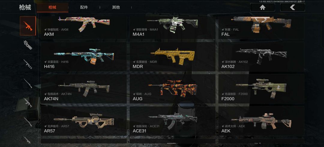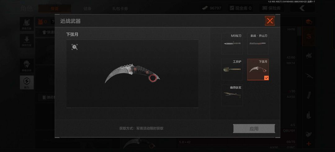 短刀有下弦月,长刀有年限幽燕钛玄,人物白蔷薇,淘金客(光头强)和年限清影。还有近百个枪皮