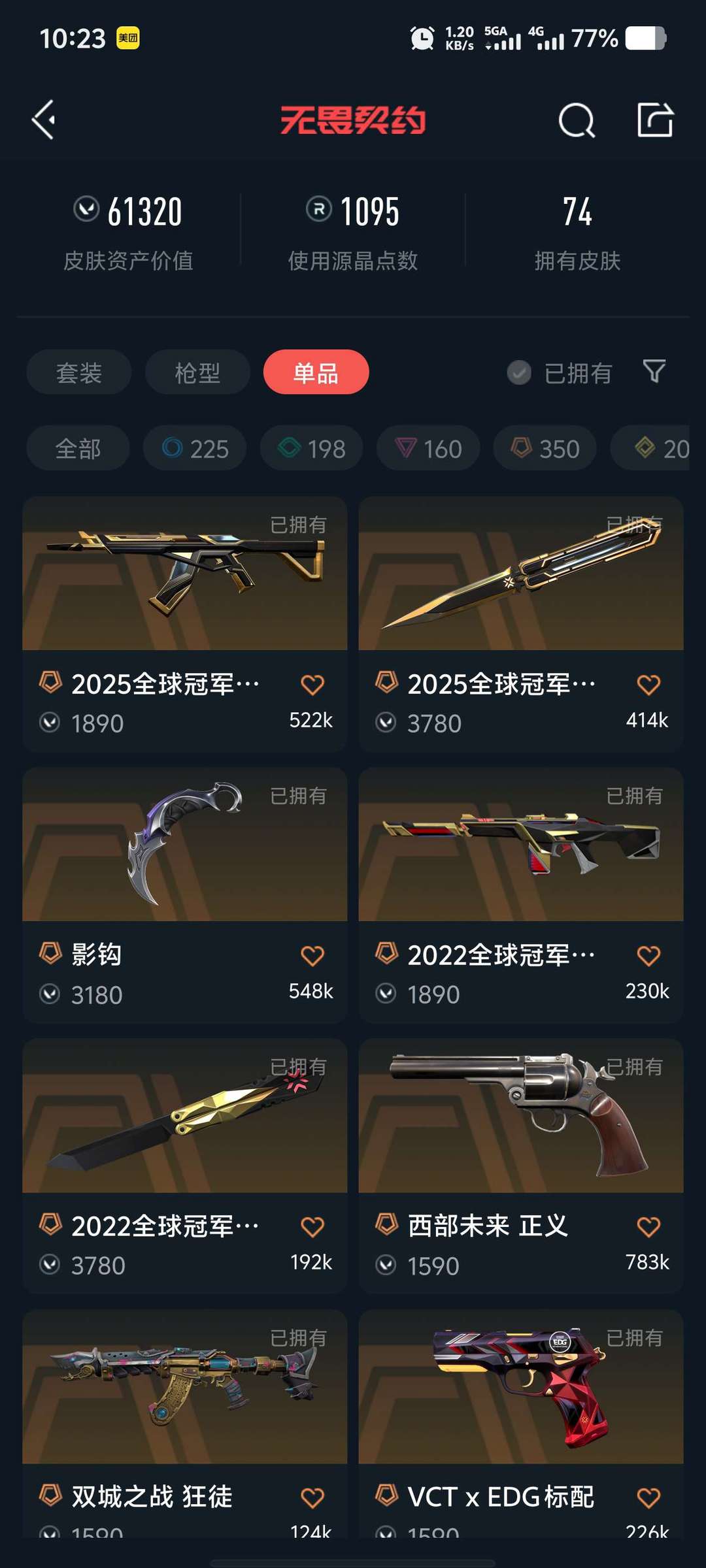 装备描述:离火刃21冠军套22冠军套24冠军套25冠军套双城之战AK 六万资产74皮肤