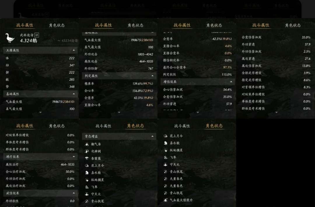 装备描述:等级100,风华值57614,武林造诣4.324鹅,套装3金54紫,载具4,清河6级,开封6级,开封皇宫4级,河西6级,不见山6级,战令65,详情见图