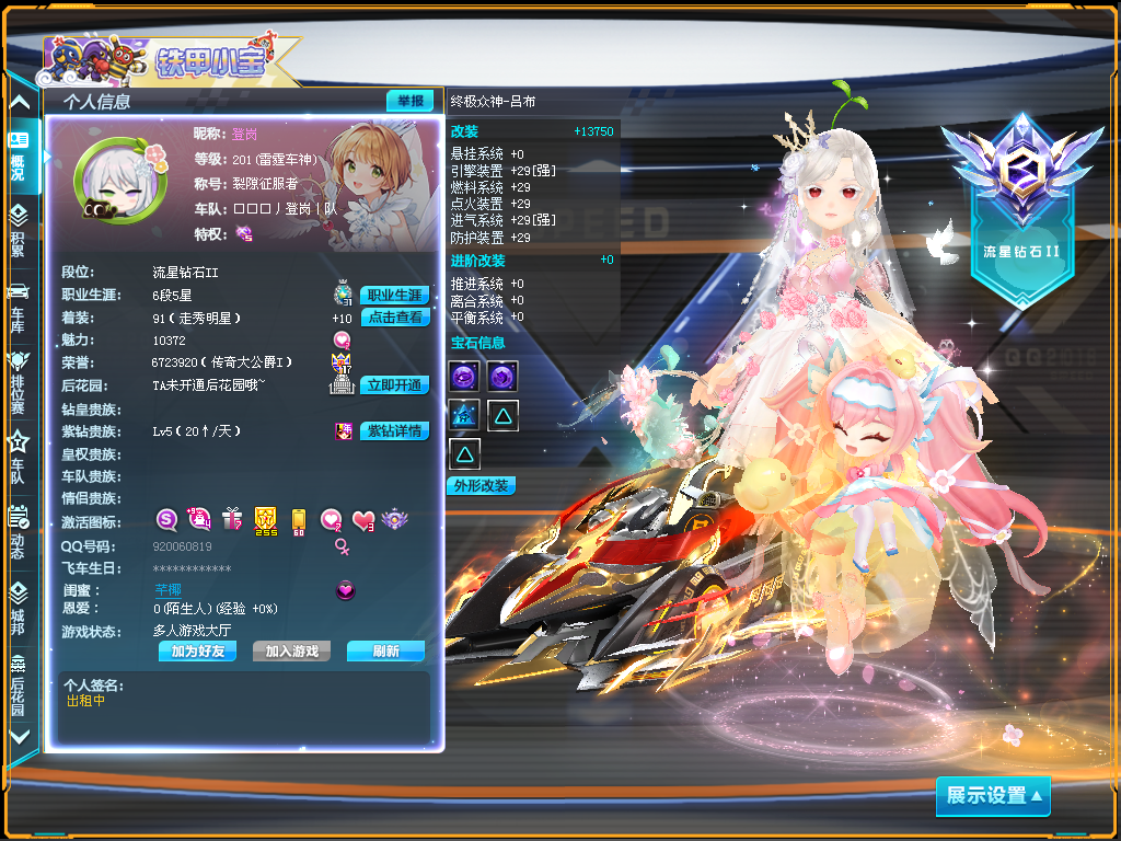 装备描述:账号里有全29双4级宝石的终极众神吕布+阿尔法之芯黑客+阿尔法之芯海姆达尔+雷诺樱花+魔力小狼+无人驾驶AE86+3竞速宝石神影寒冰+强10幻海之莹+强9甜心公主; 可以排位、巅峰赛、边境都行,已开启到时不下,到时间不会故意顶号; 游戏时请勿使用三方软件,禁止小学生租用本账号,请勿使用本账号发布任何广·告信息