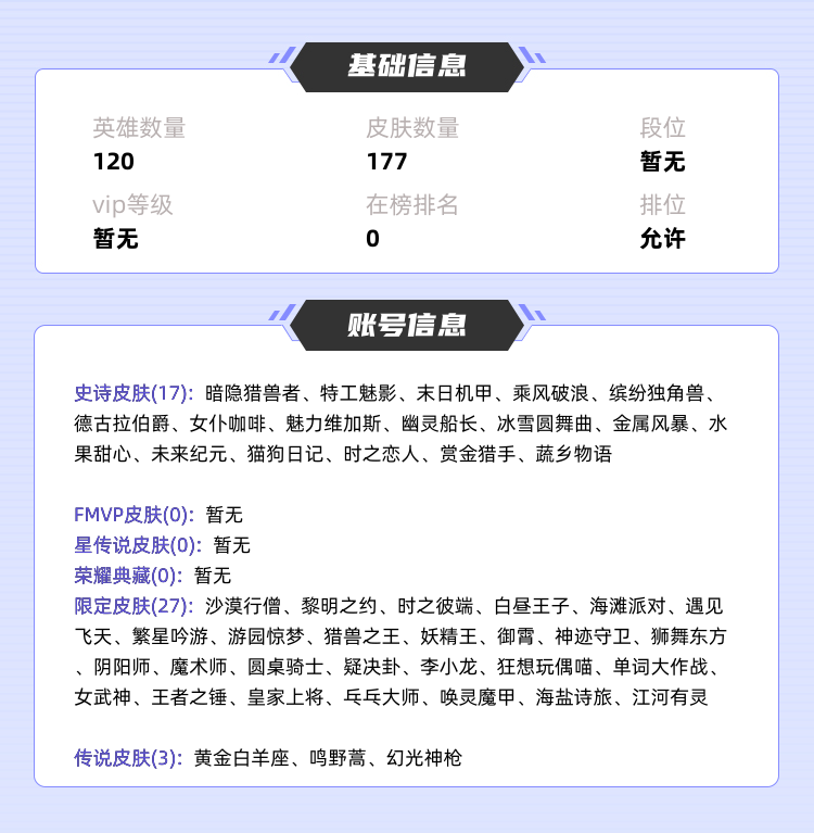 装备描述:>>>>>>毁号,涉及毁坏虚拟财产罪及计算机安全罪,请文明游戏素质游戏,让我们共建美好租号平台>>>>>> 本游戏账号: ,英雄多,皮肤多。 私人所属英雄皮肤有:张良 黄金白羊座||云缨 幻光神枪||桑启 鸣野蒿米莱狄 御霄||阿古朵 江河有灵||刘禅 唤灵魔甲||项羽 海滩派对||赵云 皇家上将||鲁班七号 狮舞东方||蔡文姬 繁星吟游||艾琳 女武神||甄姬 游园惊梦||盾山 圆桌骑士||裴擒虎 李小龙||雅典娜 黎明之约||雅典娜 单词大作战||钟馗 神迹守卫||吕布 猎兽之王||钟无艳 王者之锤||孙膑 妖精王||鲁班大师 乓乓大师||达摩 沙漠行僧||杨玉环 遇见飞天||蒙犽 狂想玩偶喵||妲己 时之彼端||桑启 海盐诗旅||明世隐 疑决卦||嬴政 白昼王子||狄仁杰 魔术师||狄仁杰 阴阳师,等等 注意事项: A.游戏过程中请不要恶意挂机或者不文明发言;B.恶意挂机、顶号等行为将被拉黑无法再次下单;C.进入游戏后中途请勿退出登陆,否则无法再次上号;D.部分账号由于异地登录可能会出现密码错误提示,通常再尝试5-6次后可上号。 |||||||||>喜欢本账号请点 ☆收藏☆ 方便
