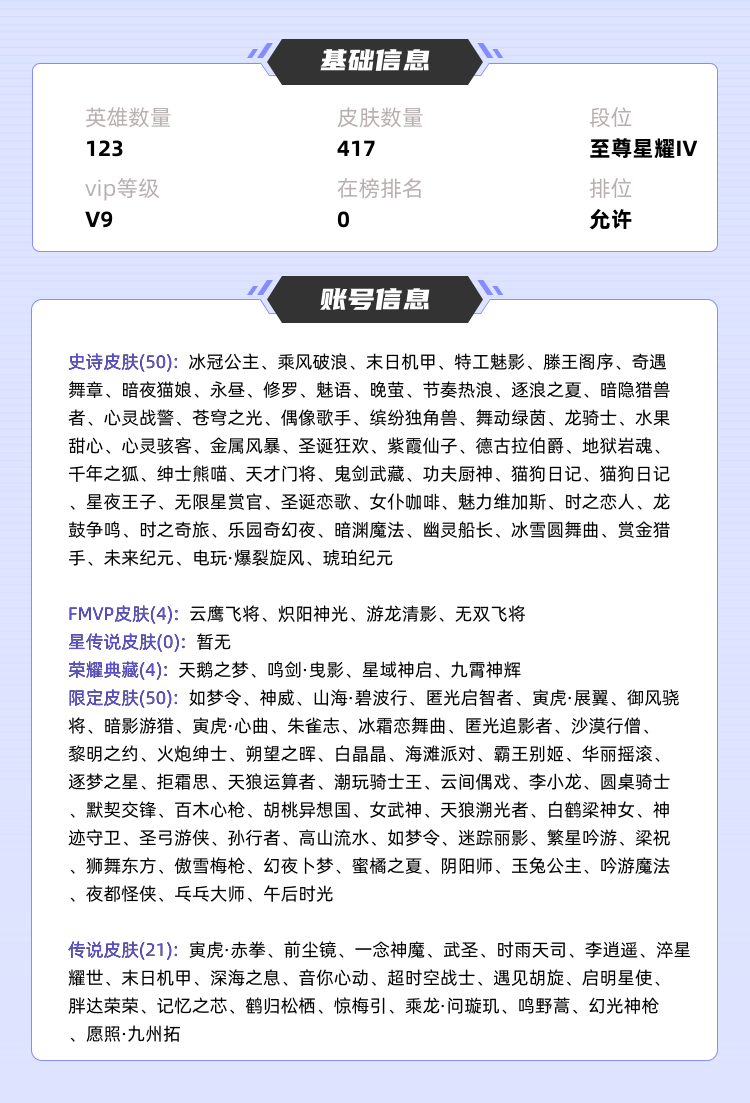 装备描述:>>>>>>毁号,涉及毁坏虚拟财产罪及计算机安全罪,请文明游戏素质游戏,让我们共建美好租号平台>>>>>> 本游戏账号: ,英雄多,皮肤多。典藏皮肤4个,感受典藏皮肤带来的优质体验快感,FMVP皮肤4个,尽情享受FMVP皮肤带来的主角光环, 私人所属英雄皮肤有:花木兰 九霄神辉||小乔 天鹅之梦||李白 鸣剑·曳影||诸葛亮 星域神启虞姬 启明星使||貂蝉 遇见胡旋||娜可露露 前尘镜||澜 愿照·九州拓||赵云 淬星耀世||曜 李逍遥||裴擒虎 寅虎·赤拳||云缨 鹤归松栖||云缨 幻光神枪||公孙离 记忆之芯||马可波罗 深海之息||宫本武藏 惊梅引||周瑜 音你心动||梦奇 胖达荣荣||关羽 武圣||李信 一念神魔||孙尚香 末日机甲||孙尚香 乘龙·问璇玑||诸葛亮 时雨天司||桑启 鸣野蒿||狄仁杰 超时空战士,等等 注意事项: A.游戏过程中请不要恶意挂机或者不文明发言;B.恶意挂机、顶号等行为将被拉黑无法再次下单;C.进入游戏后中途请勿退出登陆,否则无法再次上号;D.部分账号由于异地登录可能会出现密码错误提示,通常再尝试5-6次后可上号。 |||||||||>喜欢本账号请