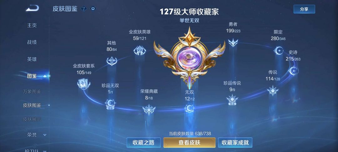 650多皮肤,无双跟珍品全齐,10星传说,6典藏。英雄全齐。天幕也有。请文明租号不要用道具跟戳戳