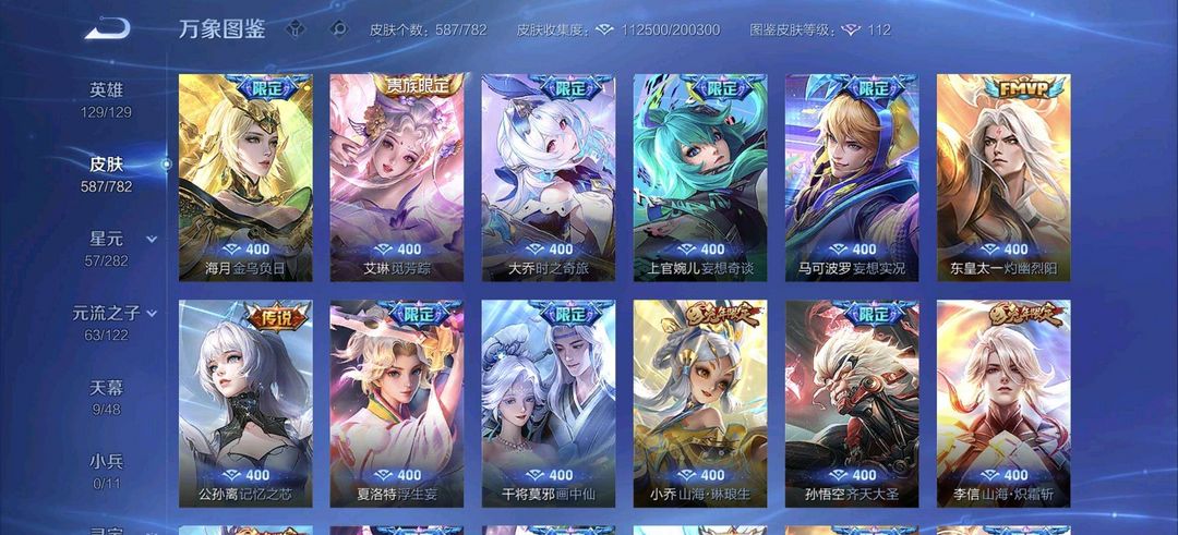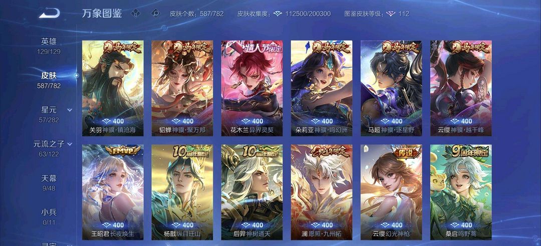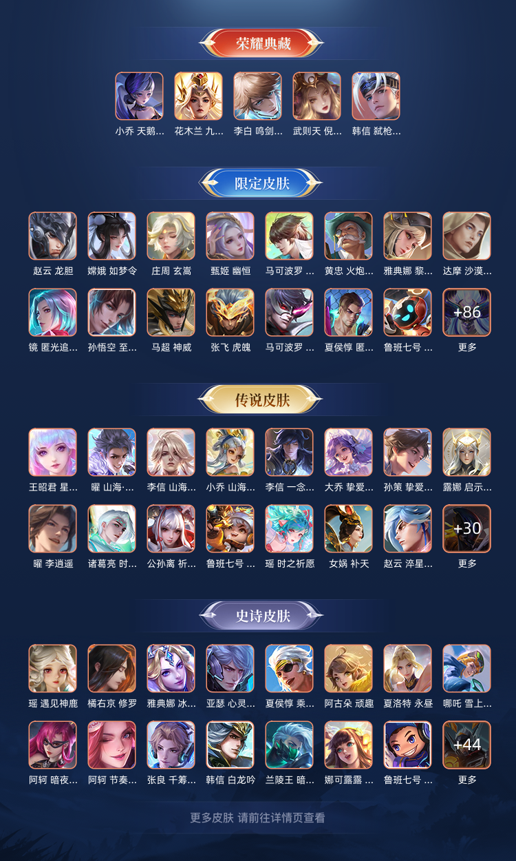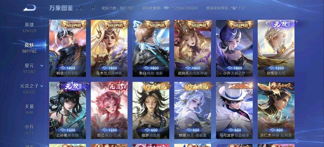 荣耀王者 V10 五典藏,590皮肤怪盗基德/至尊宝/离恨烟/白虎志/无相/纵目迁山/青丘九尾