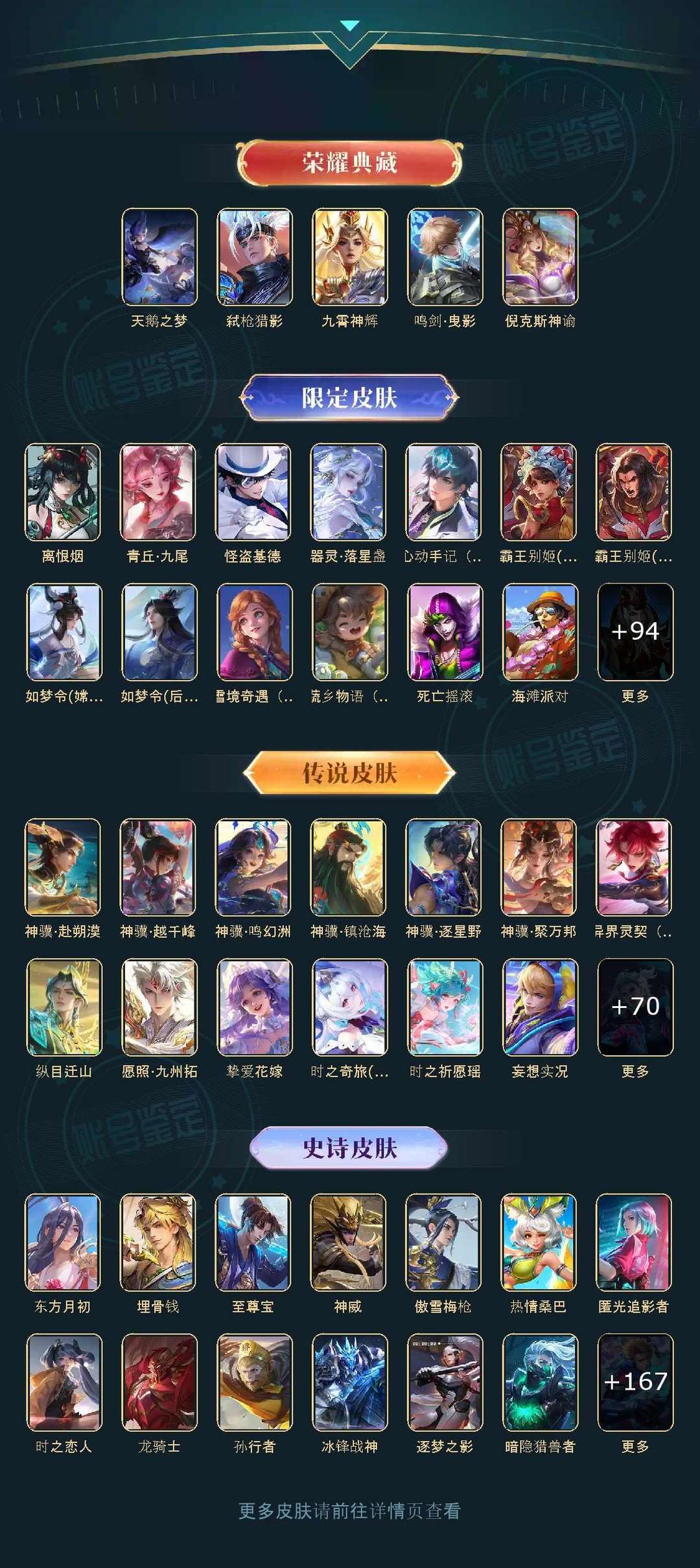 装备描述:贵族等级V10,段位荣耀王者,英雄数量129,典藏皮肤数5,皮肤数量588,天鹅之梦/至尊宝/热情桑巴/白虎志/无相/纵目迁山/愿照·九州拓/匿光追影者/异界灵契(花木兰)/鸣剑·曳影/时之奇旅(大乔)/无双飞将/时之祈愿瑶/默契交锋(兰陵王)/挚爱之约/挚爱花嫁/李逍遥/默契交锋(花木兰)/神骥·赴朔漠/器灵·落星盏/神骥·越千峰/神骥·鸣幻洲/离恨烟/东方月初/零号·赤焰/妄想实况/埋骨钱/深海之息/补天/神骥·镇沧海/怪盗基德/神骥·逐星野/弑枪猎影/异界灵契/神威/神骥·聚万邦/炽阳神光/启示之音/心动手记(海诺)/九霄神辉/神树通天/青丘·九尾/傲雪梅枪/天鹅之梦/至尊宝/热情桑巴/白虎志/无相/纵目迁山/愿照·九州拓/匿光追影者/异界灵契(花木兰)/鸣剑·曳影/时之奇旅(大乔)/无双飞将/时之祈愿瑶/默契交锋(兰陵王)/挚爱之约/挚爱花嫁/李逍遥/默契交锋(花木兰)/神骥·赴朔漠/器灵·落星盏/神骥·越千峰/神骥·鸣幻洲/离恨烟/东方月初/零号·赤焰/妄想实况/埋骨钱/深海之息/补天/神骥·镇沧海/怪盗基德/神骥·逐星野/弑枪猎影/异界灵契/神威/神骥·聚万邦/炽阳神光/