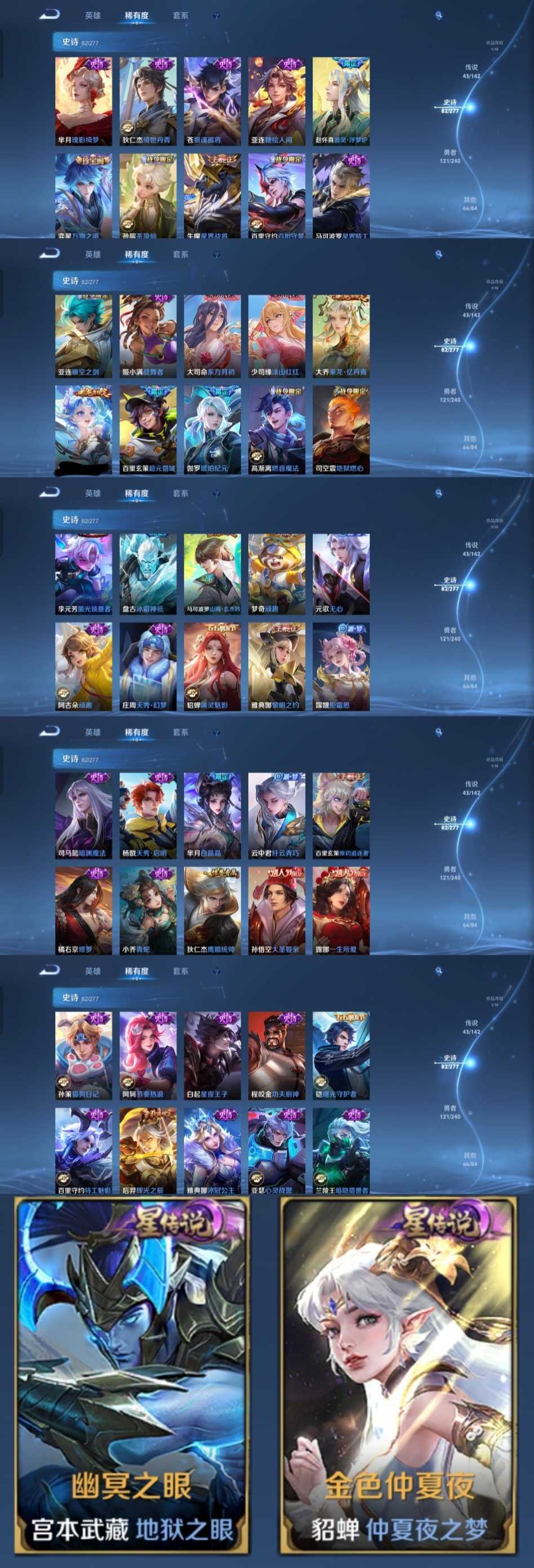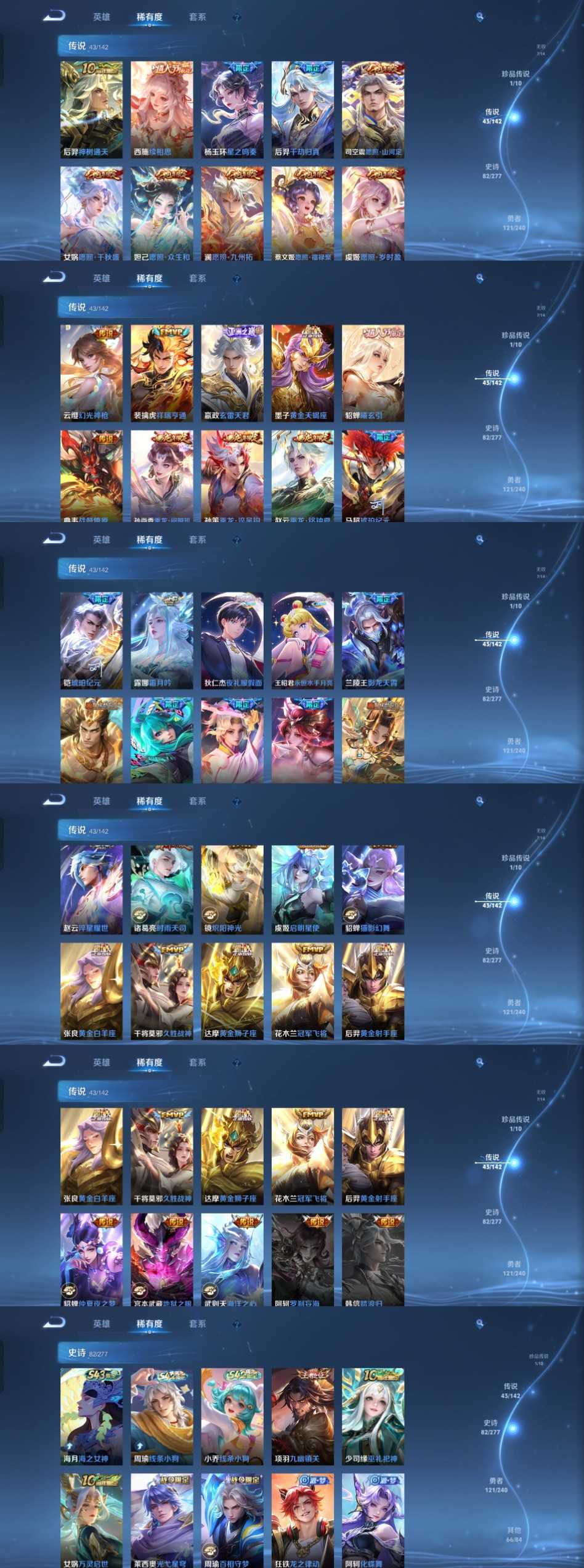 限制: 撤单率<49%才可租用此帐号装备描述:该号英雄130个皮肤321个,典藏2个,无双7个,珍品传说1个,星传说3个,传说43个,史诗82个,祝你游戏愉快~