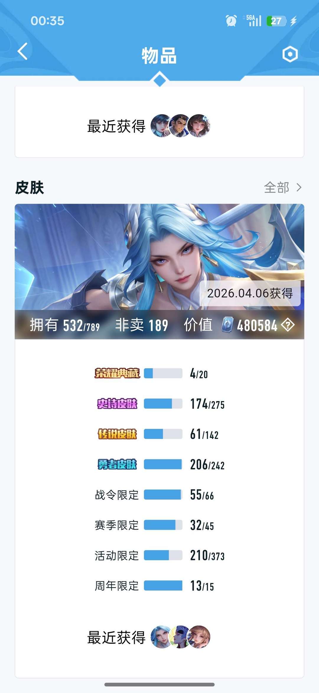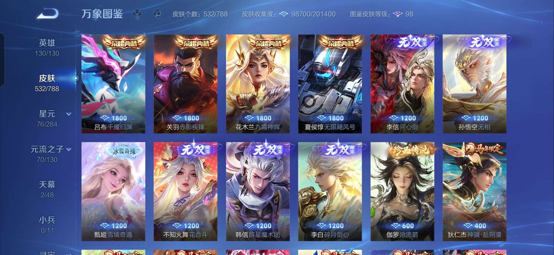 装备描述:532皮肤,全套马年限定,4典藏6无双174史诗61传说,对抗打野皮肤大部分基本都有