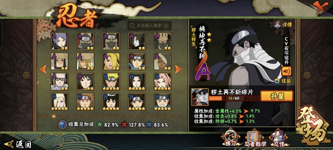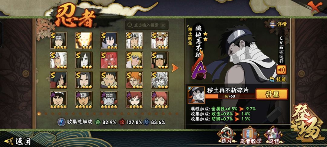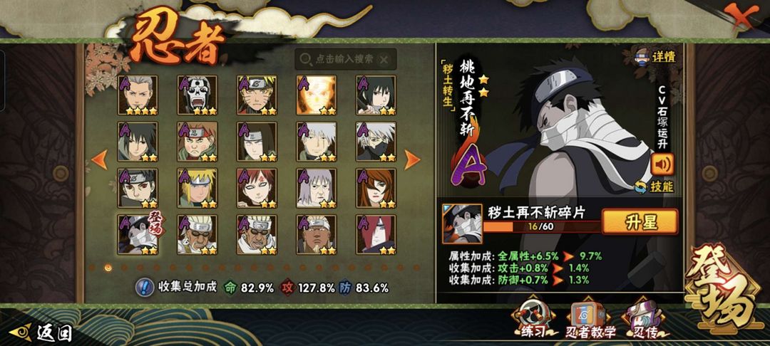 装备描述:拥有主流忍者,九喇嘛水门,巳月仙人模式秽土再不斩,仙人兜,忍战带土,秽土鼬,天道超,青年水门等强力忍者