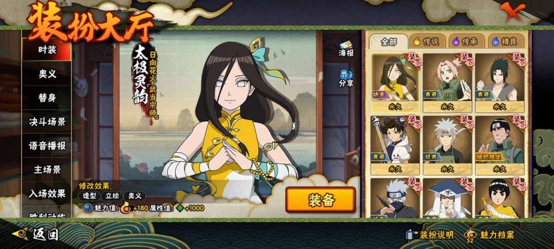 装备描述:漂泊全系列,侠隐全系列, 爱情哥,黑绝,泳装小南,忍战艾,新春止水,漂泊再不斩已秒 高攻击 52魅力 341忍者新忍者基本都有 如遇顶号是上位租客顶的,顶回去就好了